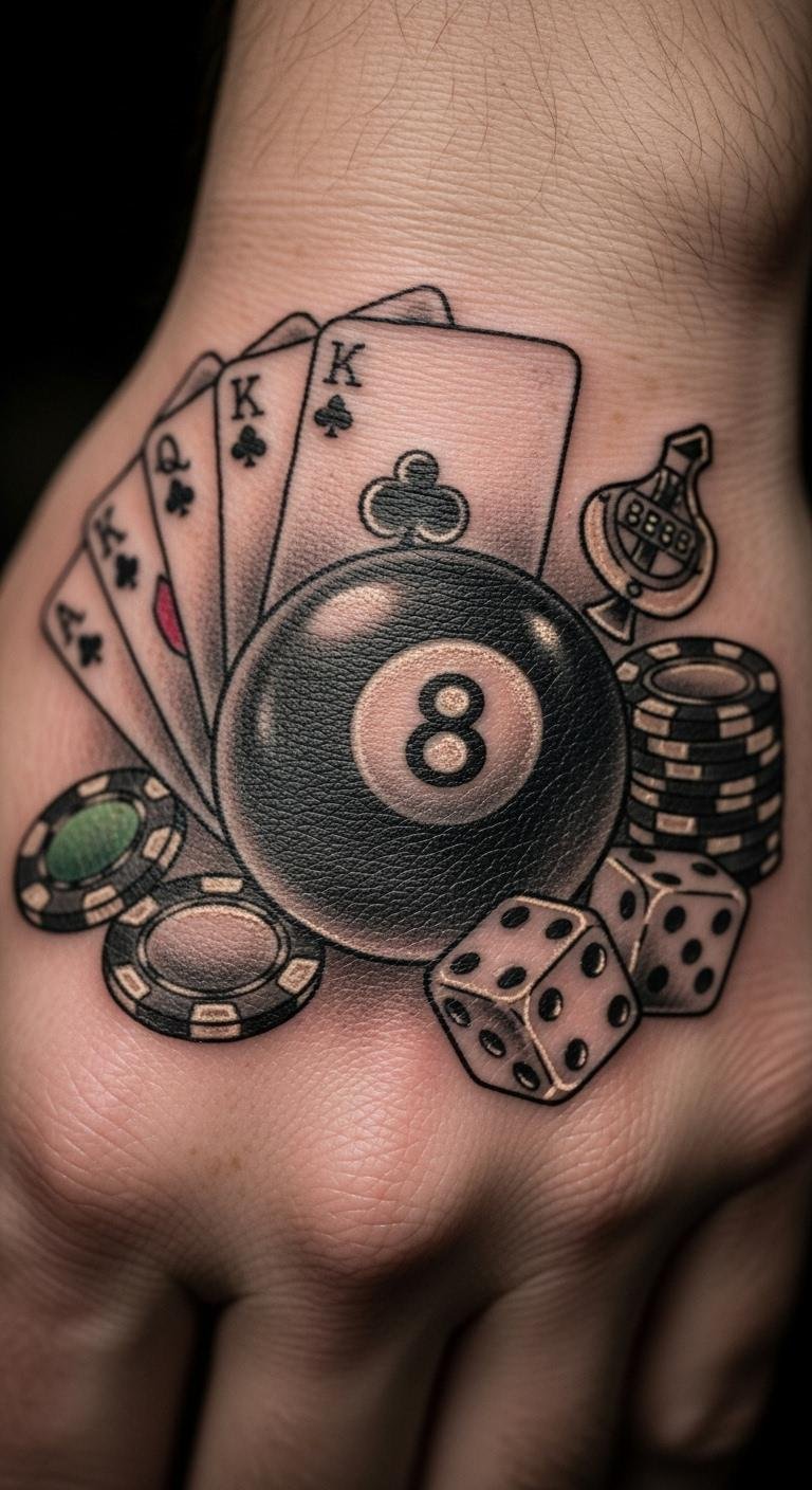 Add dice to your 8 ball for a luck twist. Place them around the ball for balance. Sketch this at home using free apps. Pick affordable ink colors from a drugstore kit. This idea fits risk-takers. Put it on your wrist for easy show-off. Combine with simple shapes you draw yourself. It draws eyes without breaking the bank. Go for small sizes to cut costs. Make it personal by adding your lucky number.
