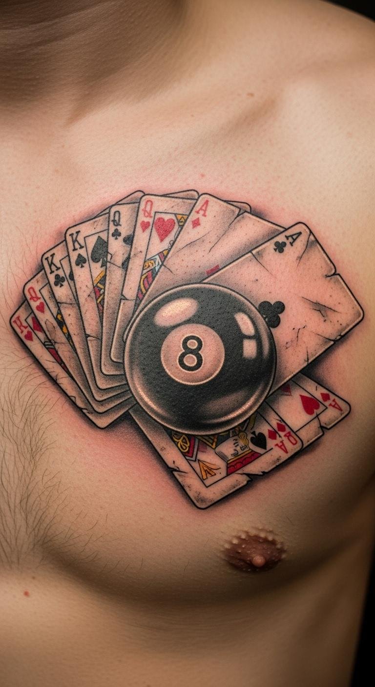 Mix in cards for a full theme. Arrange them around the ball. Use apps to design at home for free. Test with markers you already have. This idea plays to poker fans. Spot it on your chest for boldness. Add simple suits you sketch quick. Save money on a compact version. Make it fit your card collection. It stands out in groups easily.