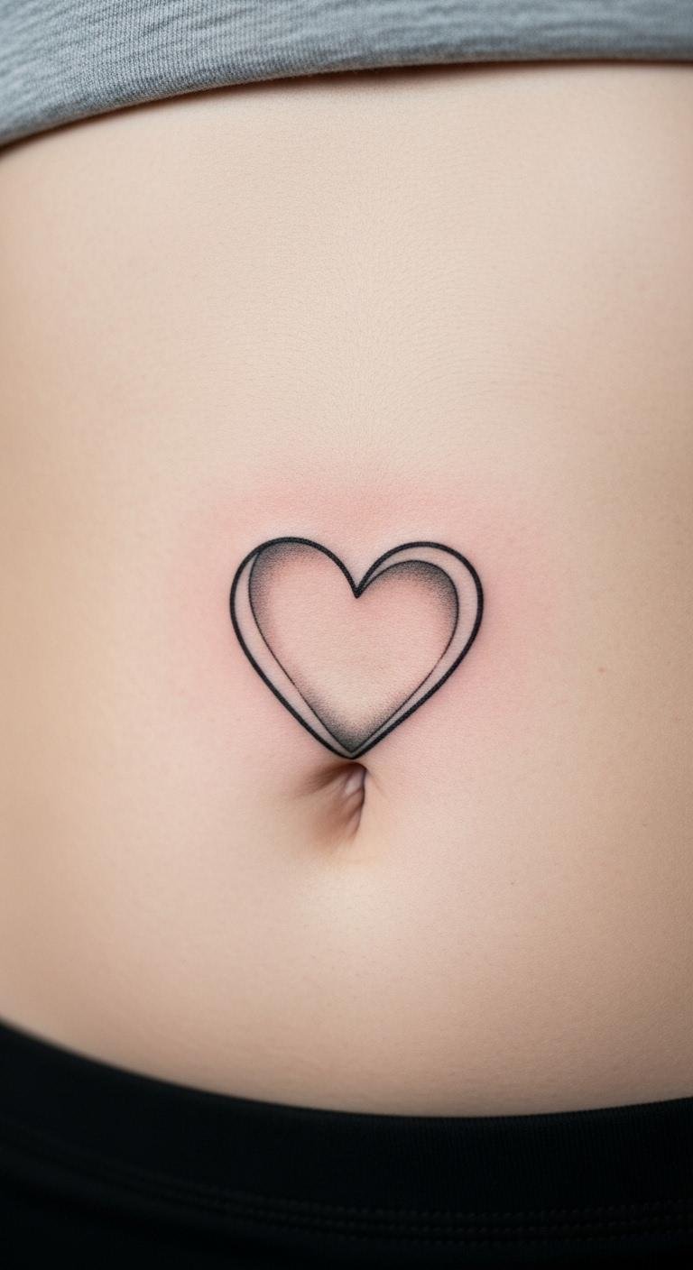 A minimalistic heart tattoo keeps things straightforward and elegant. Think a small heart above your navel for a subtle touch. It represents love in your way, whether for family or yourself. Start by sketching ideas on paper with a basic pen. This costs nothing and helps visualize the look. Find free apps like Ink Hunter to try designs virtually on your phone. Talk to a local artist for quotes; many offer sessions under $100 for simple ink. Keep the area clean afterward with drugstore lotion. This design works well if you want something that hides easily under clothes. Go for black ink to last longer without fading fast. Pair it with daily routines, like applying sunscreen during beach days. Easy choices like this make tattooing fun and low-stress.