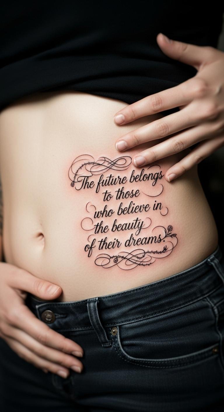 A quote with personal meaning inspires on your abdomen. Envision words that motivate. It tells your story directly. Write quotes in a notebook. Apps font them free. Prices are about $120. Center it properly. Use basic care items. Quotes last long. Choose short ones for cost. This makes it personal.