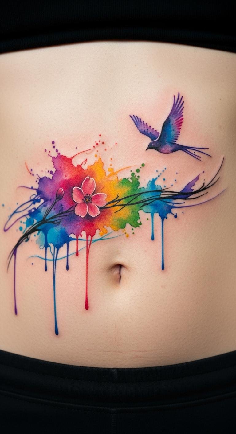 Watercolor style tattoo paints your abdomen artistically. Think soft blends of color. It evokes creativity. Experiment with paints at home. Free editors simulate it. Costs around $150. Flow it naturally. Maintain with gentle products. Colors stay vivid. Opt for light designs. Easy planning helps.