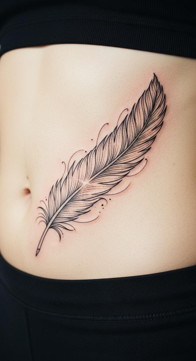 A symbolic feather for courage adds meaning to your abdomen. Picture a single feather design that flows with your body’s shape. It stands for bravery in everyday life. Sketch feathers from bird images online as a free starting point. Apps like Procreate offer free trials to build your concept. Artists might charge $120 for this style, keeping it affordable. Center it near the navel for a balanced look. Care for it with everyday creams to prevent irritation. Feathers suit various skin types and stay clear through changes. Choose basic black for longevity without extra fees. This approach helps you personalize ink without hassle.