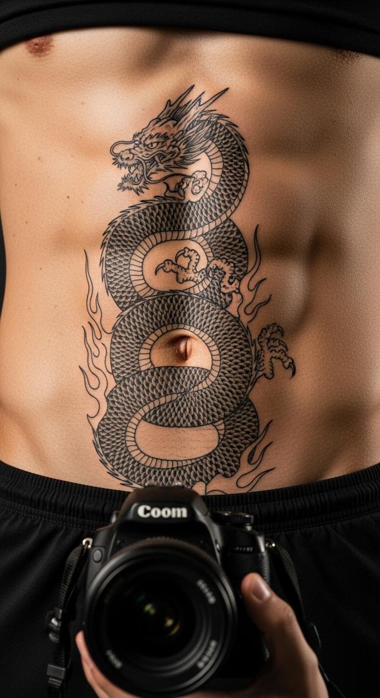 A dragon tattoo on your abdomen screams power and mystery. Pick a design that wraps around your curves for a natural flow. Start by sketching ideas at home with free online tools. Budget tip: Visit a local artist during off-peak hours for lower rates. Get measurements first to ensure it fits. Think about black ink for a classic look. Add personal twists, like adding flames for extra flair. This style works well for larger areas. Pain might be an issue, so apply numbing cream ahead. Choose colors that pop but fade less over time. Real DIY example: Use phone apps to overlay designs on your photos. Keep sessions short to manage costs. End with a simple wrap for protection.