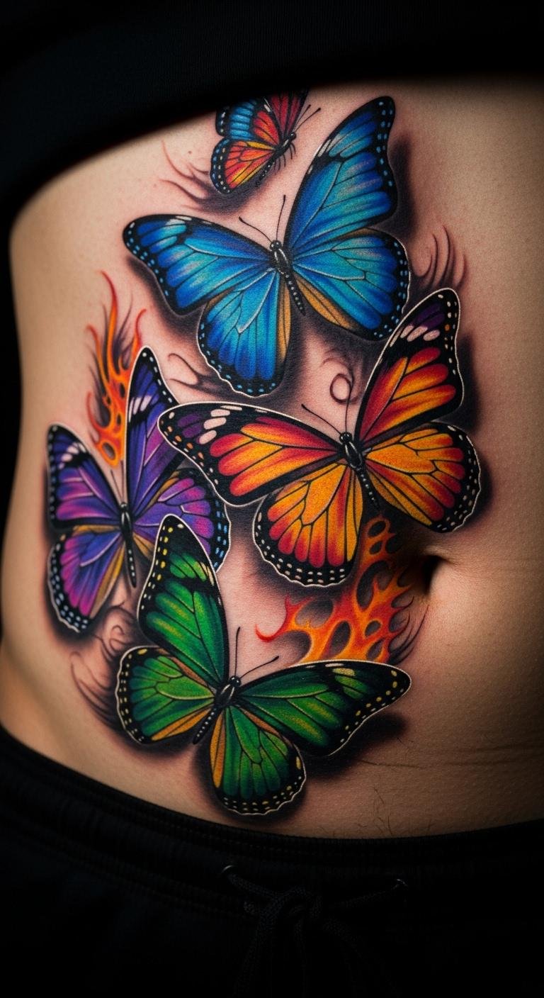 Butterflies on your abdomen signify change and growth. Choose colorful wings that flutter. Find butterfly guides. Budget tip: Use home printers for stencils. Position for transformation themes. Opt for bright hues. This links to hip tattoos. Breathe deeply before. Real DIY example: Create with fabric dyes. Divide into budget sessions. Seal with films.