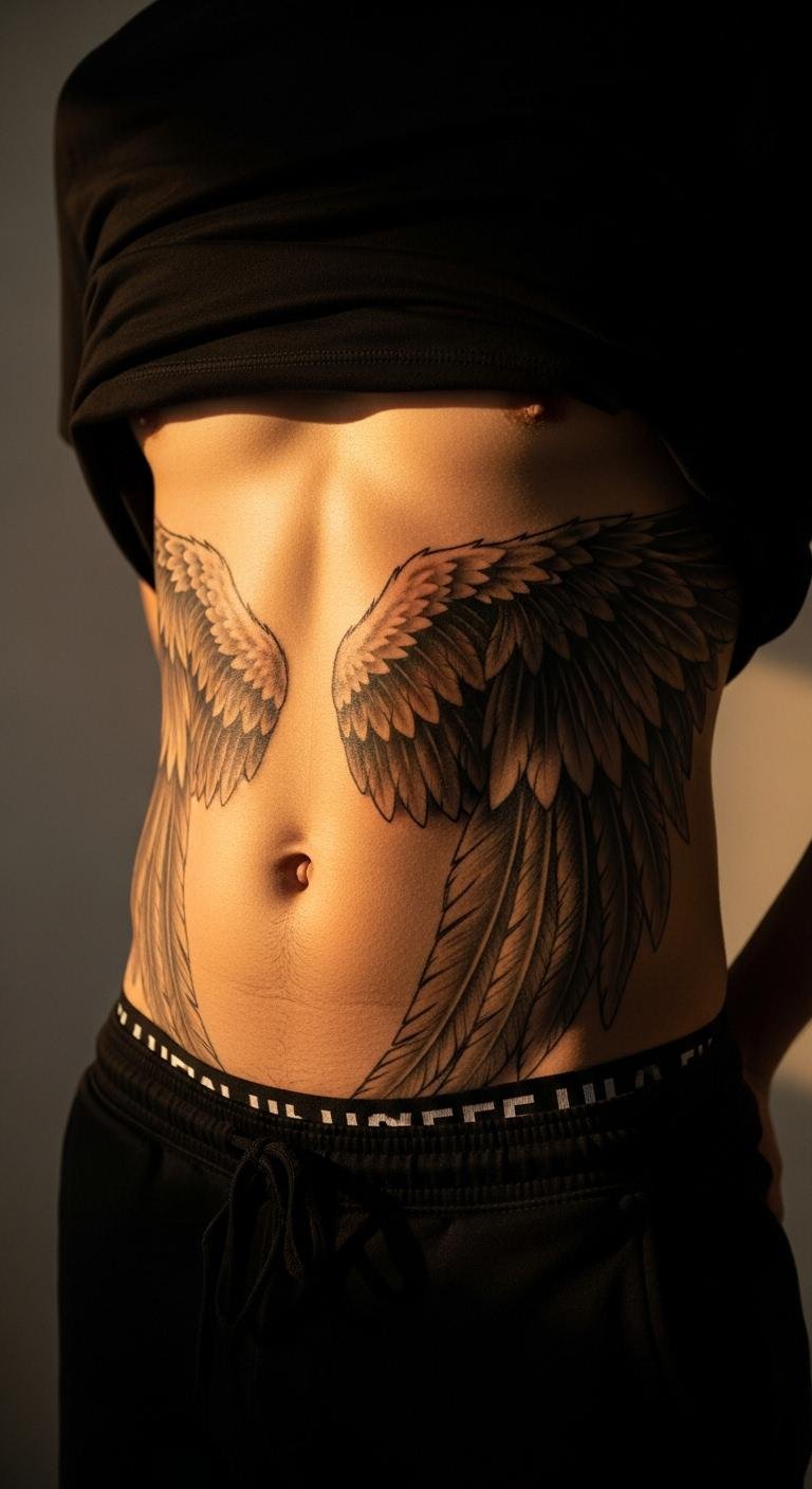 Wings across your abdomen symbolize freedom and flight. Choose spreads that enhance your physique. Find patterns on open-source sites. Budget tip: Use generic creams instead of branded ones. Align wings with your shoulders. Opt for layered shading. These connect to back tattoos seamlessly. Stretch before to loosen muscles. Real DIY example: Trace wings on mirrors. Plan for budget-friendly touch-ups. Seal with hypoallergenic tape.