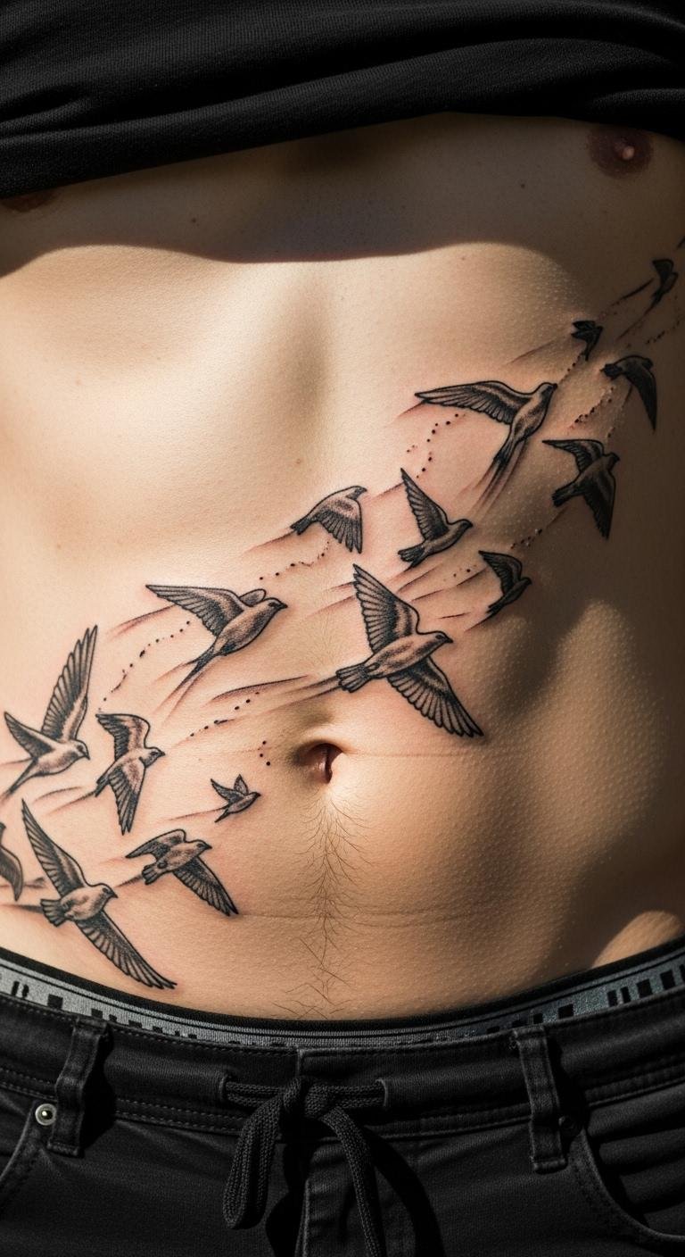 Birds in flight on your abdomen evoke adventure. Pick flocks that curve with your form. Gather ideas from nature apps. Budget tip: Share rides to the studio to cut travel costs. Position for upward movement. Use minimal colors for ease. This ties into neck designs. Rest well before appointments. Real DIY example: Paint birds on canvas first. Opt for cash payments for discounts. Apply sunscreen post-healing.