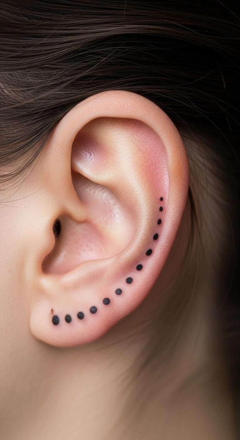 A dot behind your ear adds mystery. It speaks of hidden thoughts. Keep it tiny. Less than $35. Look for quick sessions. Draw dots on your ear with makeup. Hide it under hair for work. Test the spot with stickers. It fades slowly with care. Make it your quiet sign.