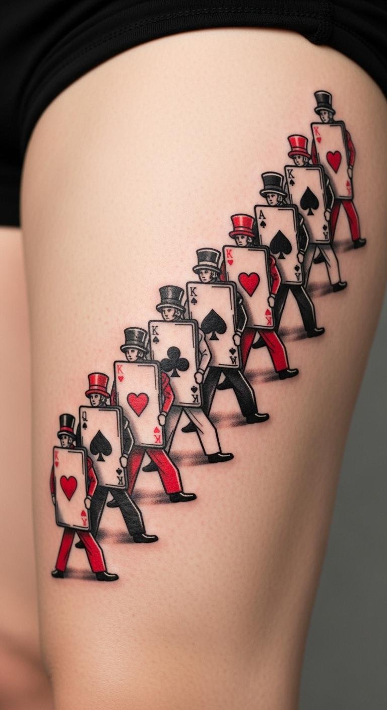 Go with card soldiers for strategy and play. This design means order in chaos. Draw cards simply. Free software adds soldiers in seconds. No extra spend. DIY hack: Cut card shapes from paper to plan. Under a buck. Real example: Tape them on your skin to preview. Fit it on your thigh neatly. Short ink sessions work best. Soldiers details add edge. Customize with your favorite suit. These steps keep it practical.