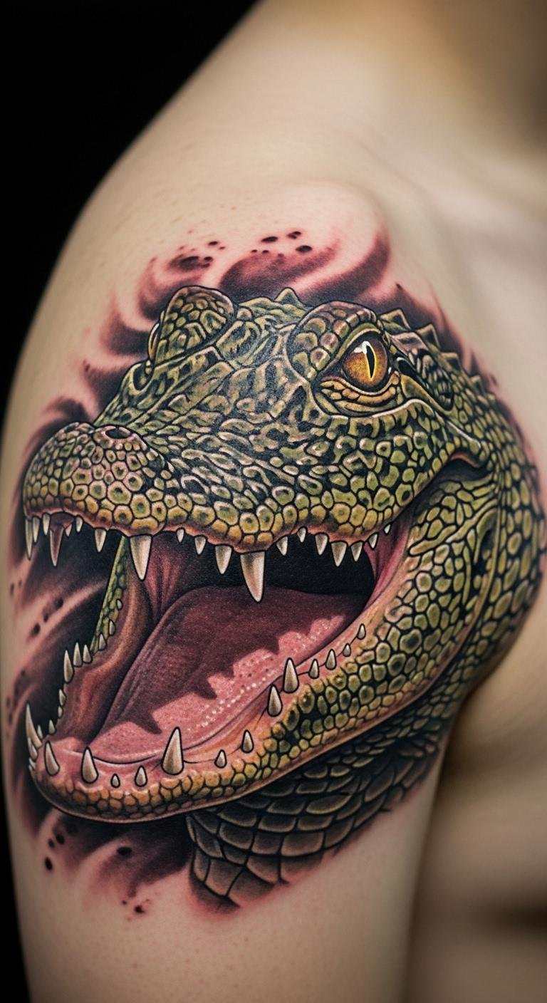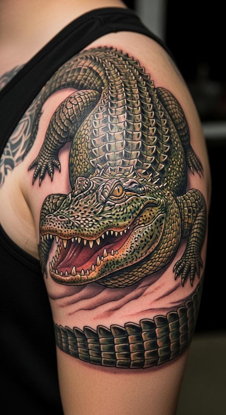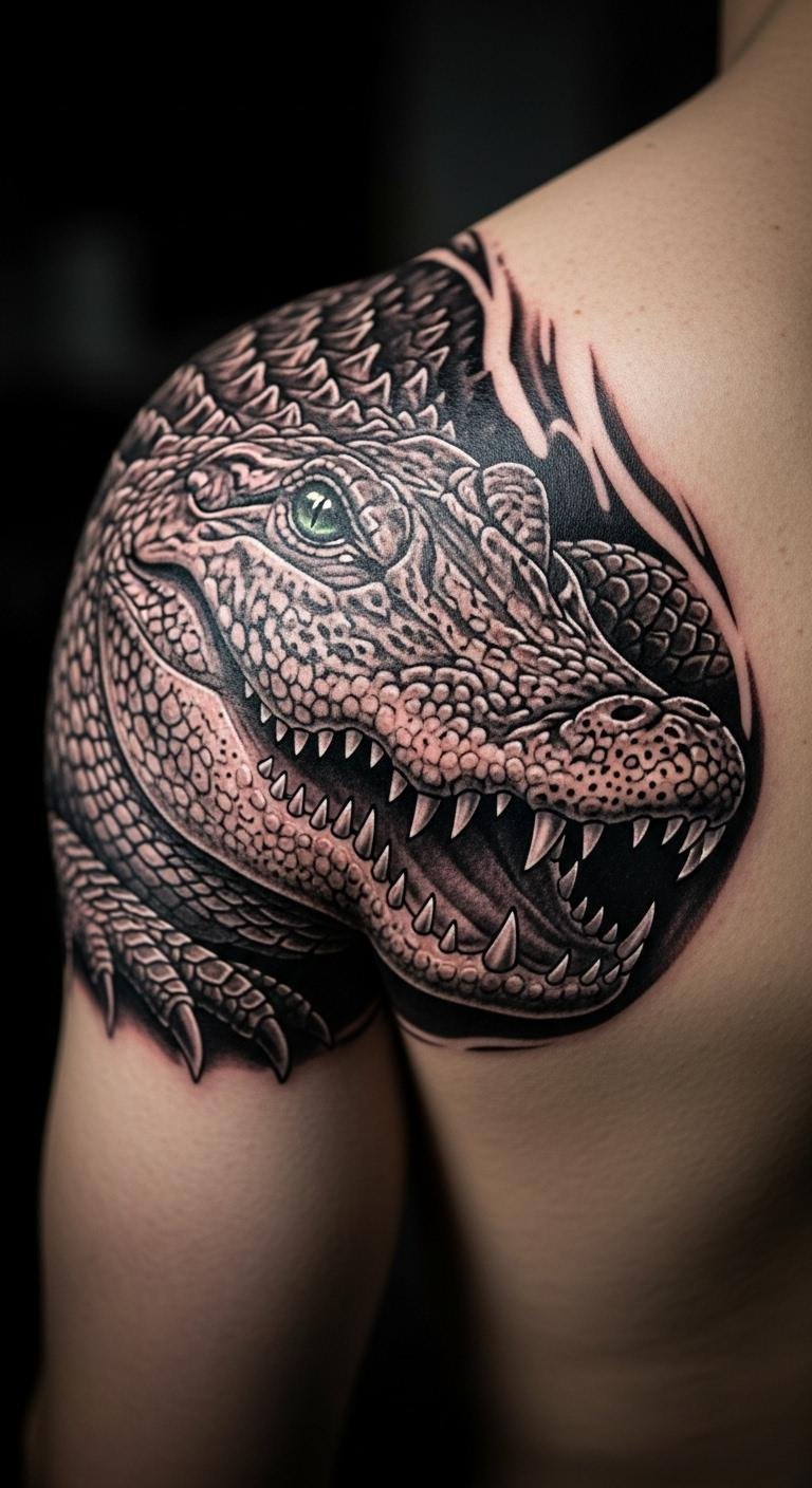 Put an alligator on your shoulder blade for a powerful spot. This placement makes it feel protective. Plan with a quick home drawing using references. Choose shoulder blades for less pain in sessions. Find affordable rates by asking around town. Try a temporary sticker first as a DIY test. Keep designs simple to lower costs. This idea adds edge without overwhelming your body.