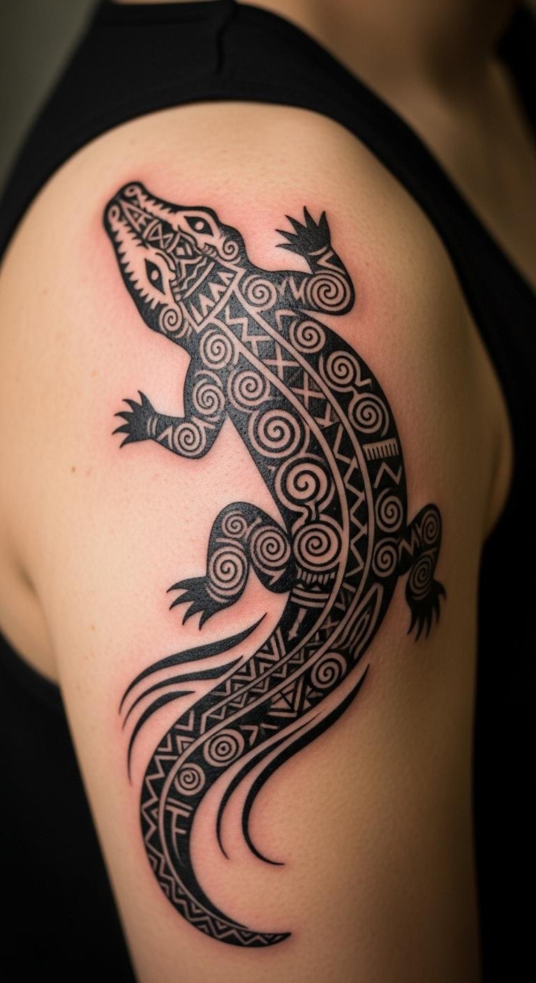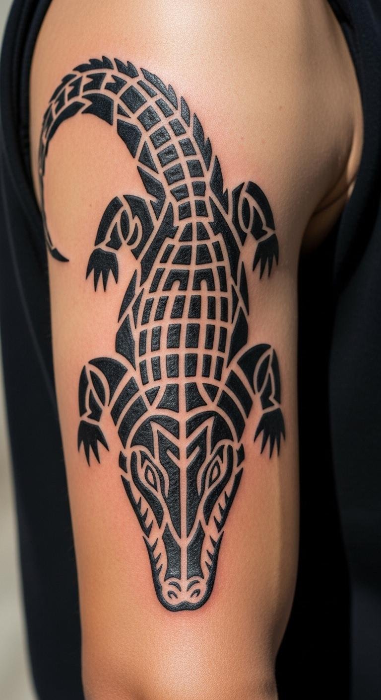 Tribal styles turn alligators into bold patterns with sharp lines. This look adds a warrior feel to your skin. Draw inspiration from online freehand tutorials using just a pen. Place it on your arm for daily visibility. Look for affordable artists at community events. Practice simple geometric shapes at home with markers—it’s an easy DIY step. Use black ink to keep costs down and make it timeless. Pair it with other tribal elements for a fuller design. This idea fits if you want something tough yet clean.