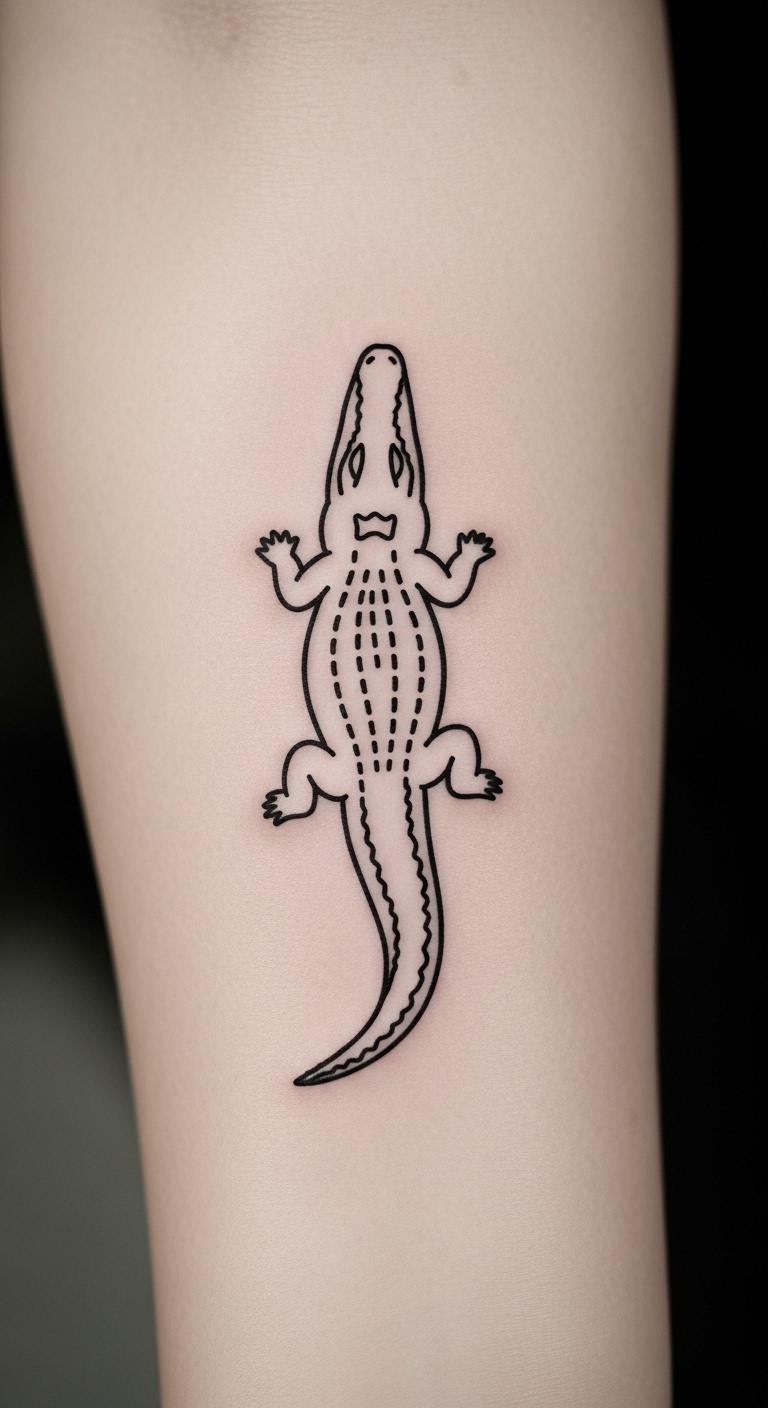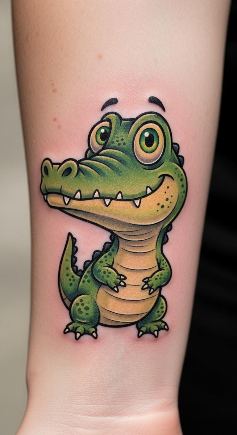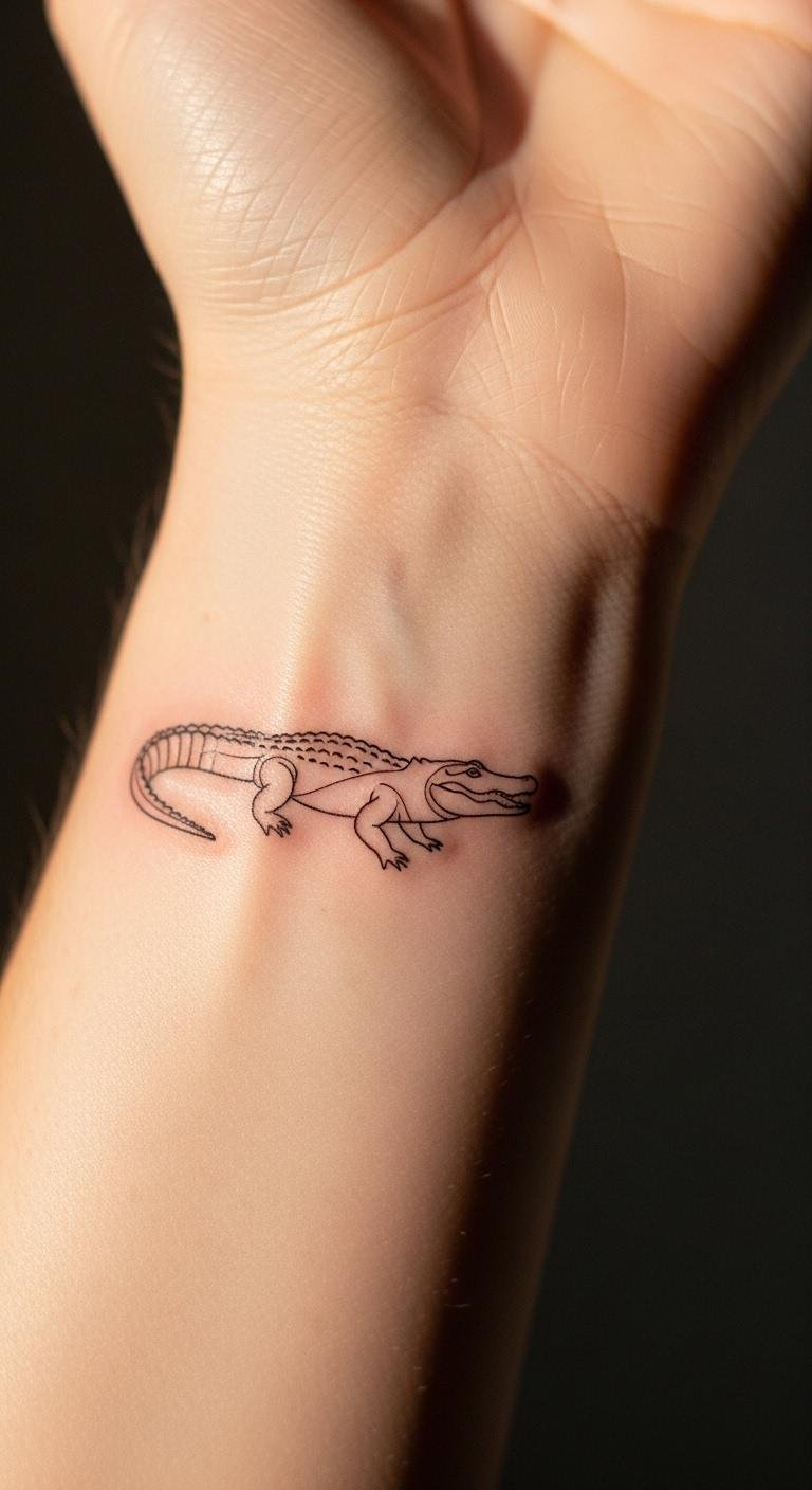 Go for a cartoon alligator that looks fun and light-hearted. This style adds a smile to your wrist. Draw your own version on paper with basic shapes—it’s quick and free. Put it on your wrist for subtle wear. Search for inexpensive artists online or at fairs. Practice doodling cartoons at home with markers for ideas. Use simple lines to keep it cheap and easy. Mix in other playful animals for variety. This tattoo suits anyone wanting a cheerful twist.