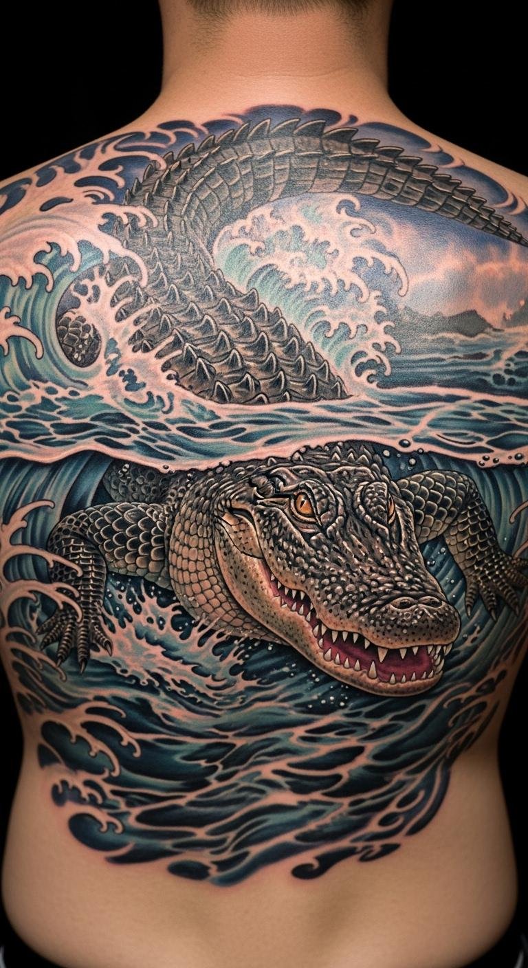 Set an alligator in a water scene on your back for a story vibe. Add waves for context. Draw the scene step by step at home. Place it on your back for grandeur. Search for affordable custom options. Use basic art supplies for DIY planning. Keep elements simple. This design adds a narrative touch.