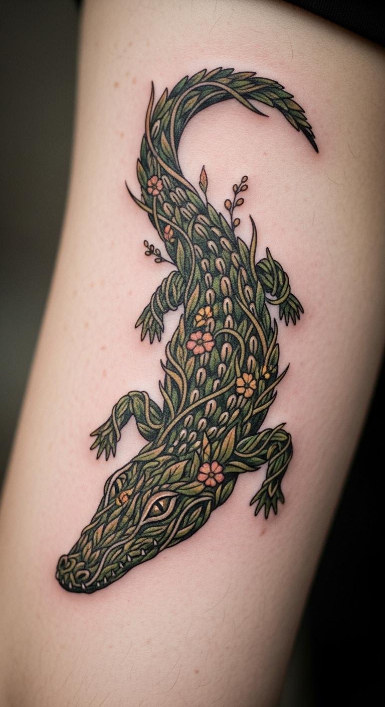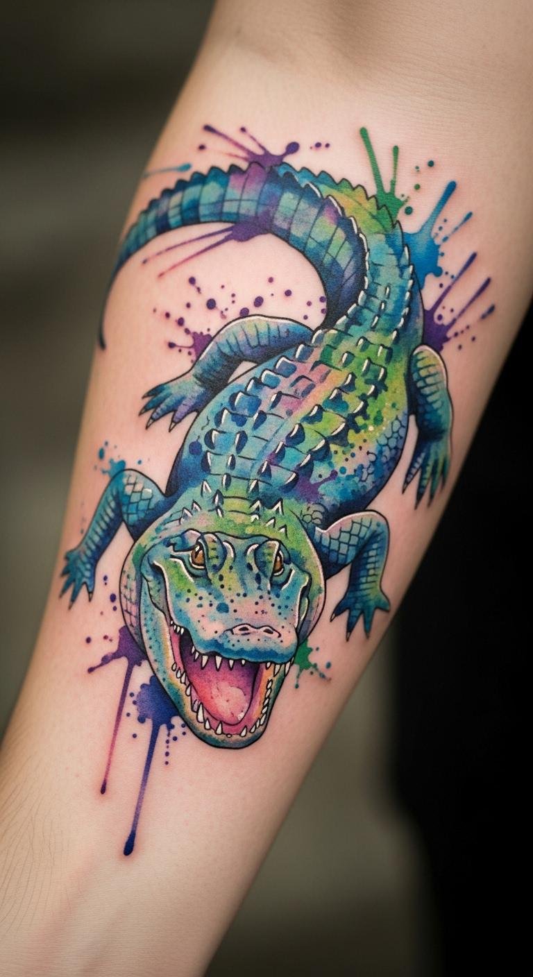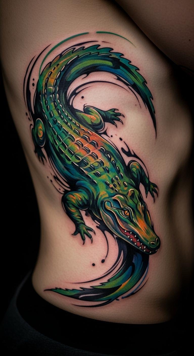 A full-color alligator brings life to your back with greens and shades. It stands out like a jungle scene. Sketch a rough outline at home with colored pencils for practice. Choose your back to hide it when needed. Find budget options by checking local tattoo shops for walk-ins. Try a small color test on paper first—it’s a simple DIY hack. Stick to fewer colors to cut expenses. Add elements like water for extra flair. This design shines if you love vibrant, eye-catching art.