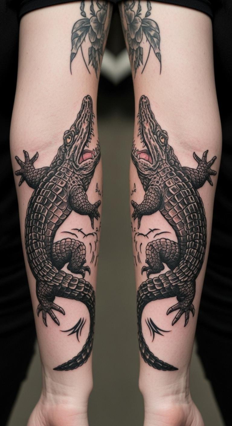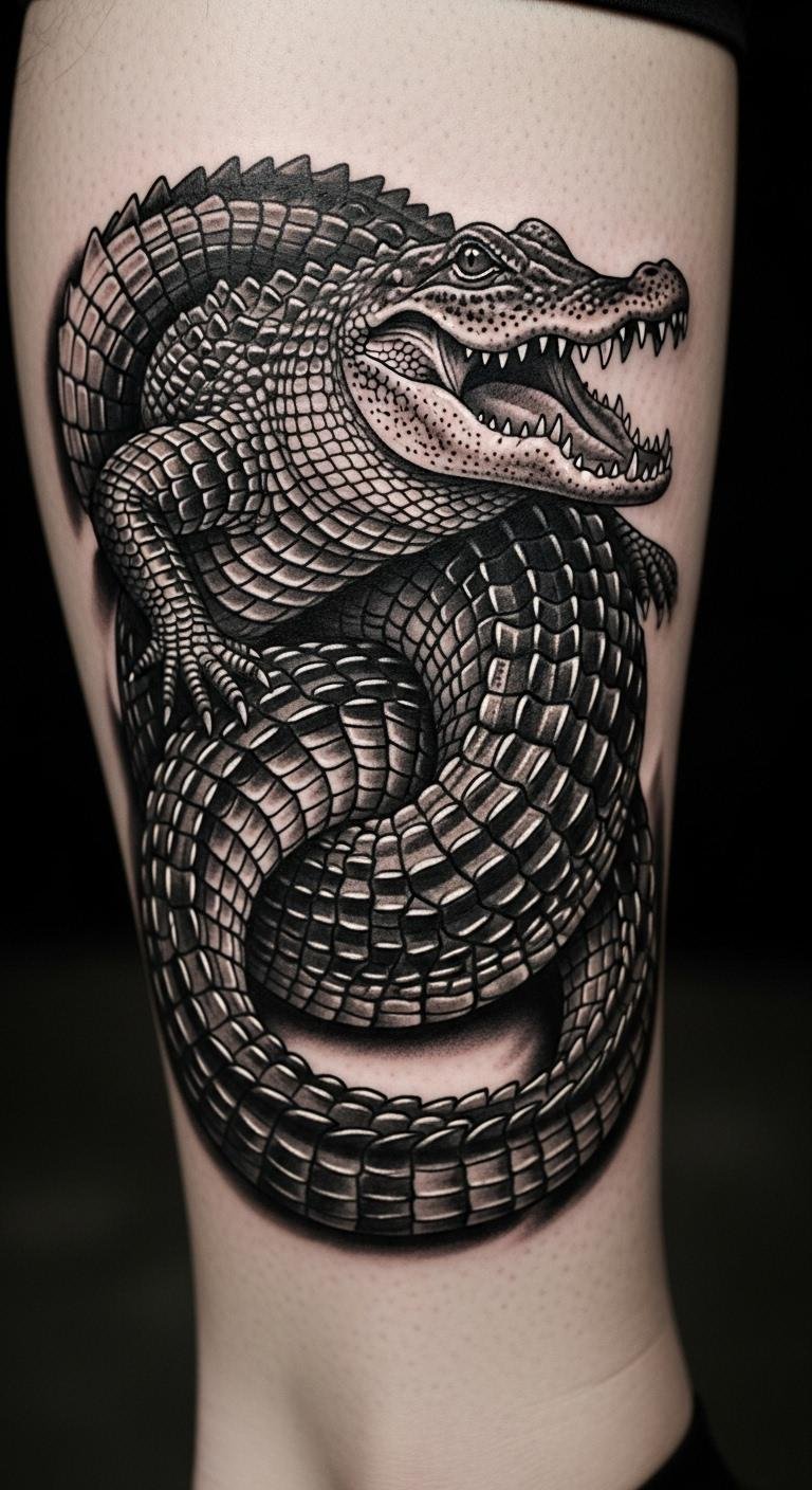 Black and white alligators offer timeless appeal on your leg. Shadows create depth. Sketch in monochrome at home. Choose your leg for balance. Find black ink specials to budget. Practice contrasts on paper. This keeps things sharp and classic.