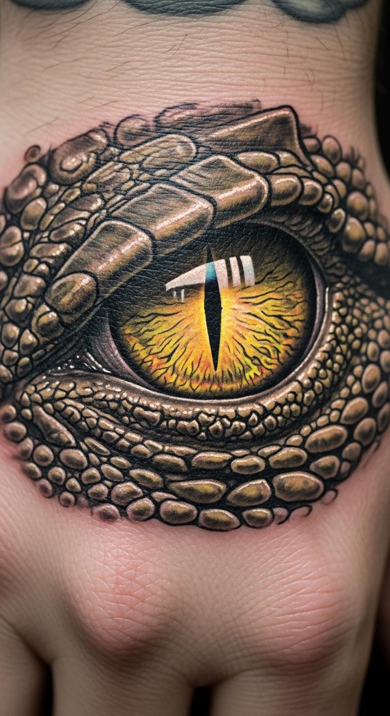 Focus on the alligator’s eye for a piercing tattoo on your hand. It’s intense and direct. Draw the eye simply at home. Place it on your hand for visibility. Seek hand tattoo deals. Use a mirror for DIY accuracy. Highlight the pupil for effect.