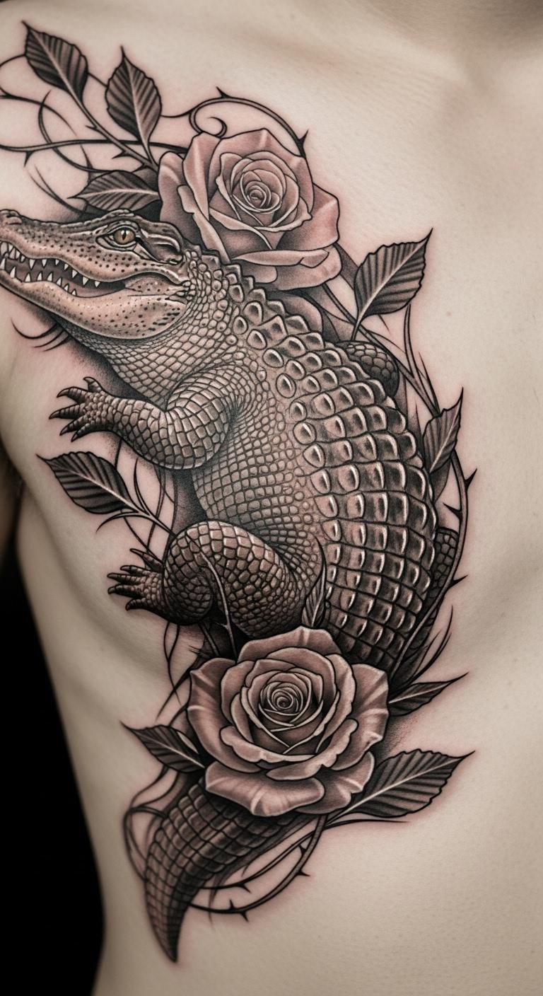 Mix an alligator with roses on your rib for contrast. Beauty and beast combined. Sketch the blend at home. Choose ribs for intimacy. Find combo deals. Practice flowers with the reptile.
