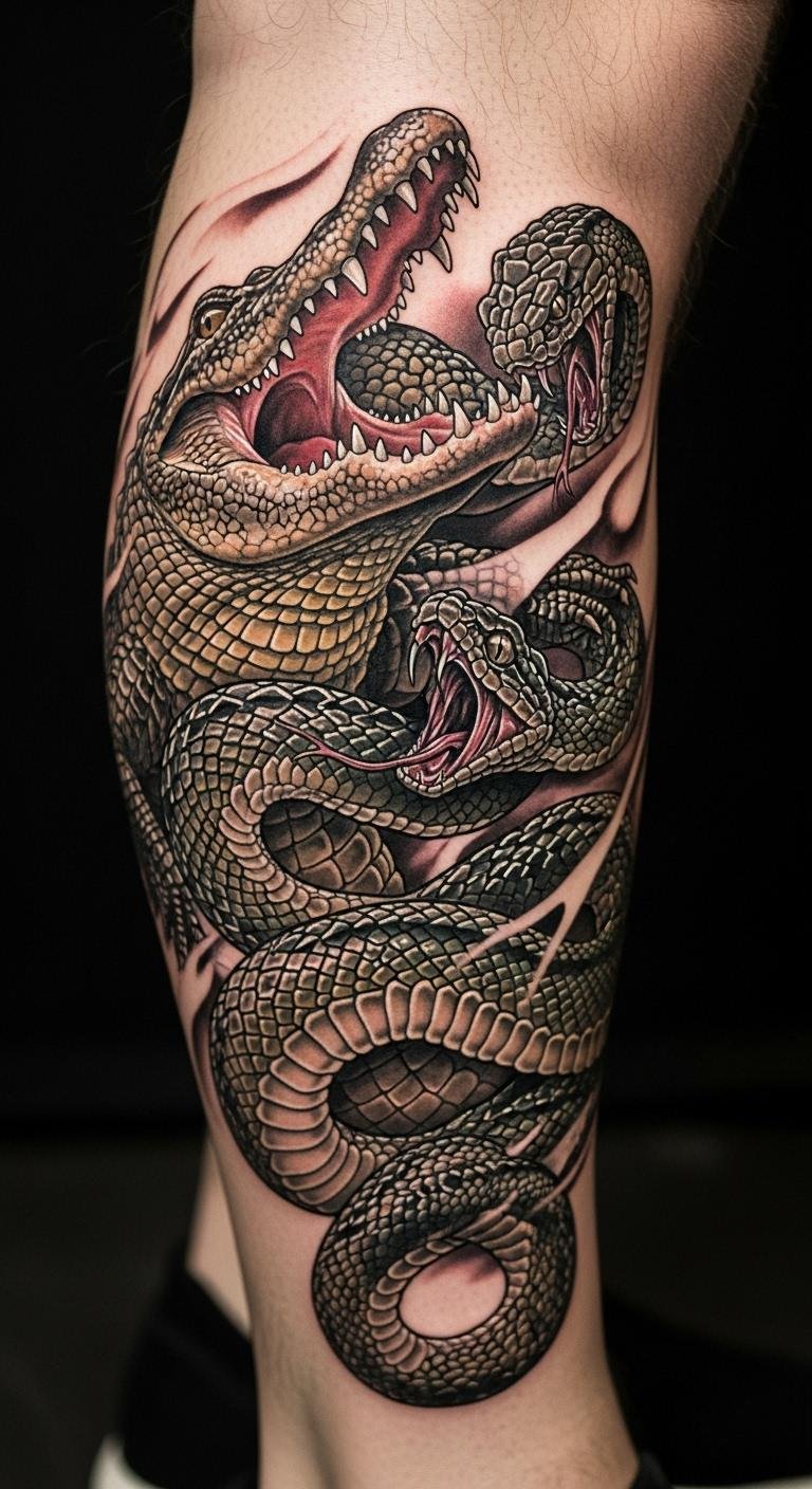Combine an alligator with a snake for a daring duo. This setup amps up the wild energy on your leg. Start by sketching both animals together on paper. Opt for your leg to balance pain and show. Look for deals at smaller studios to save cash. Try drawing the combo yourself as a DIY warm-up. Focus on key details like eyes to avoid extras. This idea works for themes of danger and adventure.