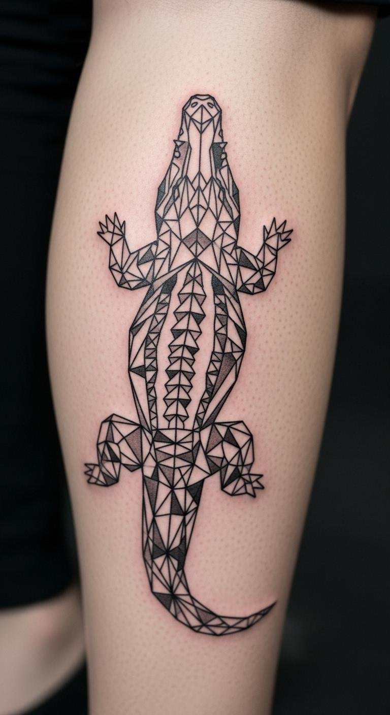 Geometric alligators turn the reptile into cool shapes on your calf. This modern twist is all about angles. Draw patterns at home using a ruler and pencil. Place it on your calf for movement. Seek out budget artists through social shares. Try geometric designs yourself on paper. Stick to black ink for longevity. This style appeals if you want abstract flair.