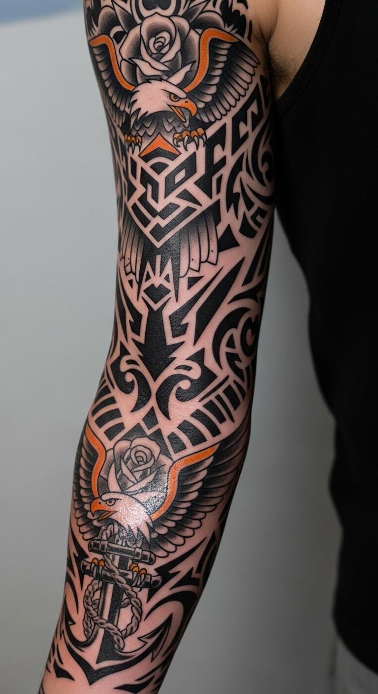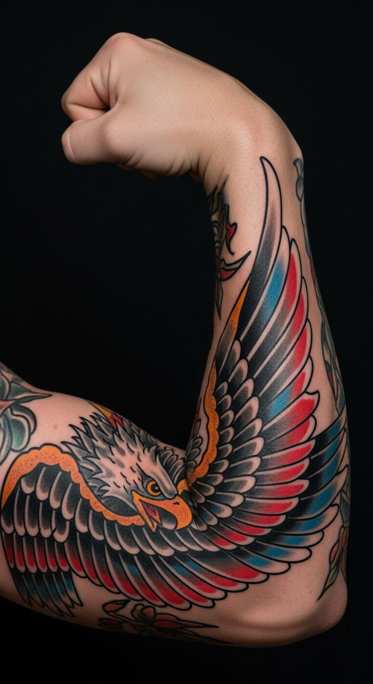 Think about the eagle as your sleeve’s centerpiece. It symbolizes strength and freedom, perfect for a bold look. Start by sketching simple eagle designs on paper. Use free online templates to experiment. Pick colors like red, white, and blue for that classic vibe. Talk to a local artist who specializes in traditional styles—they often have affordable sessions. Add personal touches, like combining it with your birth year. This keeps costs down. Try drawing it yourself with basic markers first. It helps visualize the flow. Go for thicker lines to ensure it ages well. Pair it with smaller elements for balance.