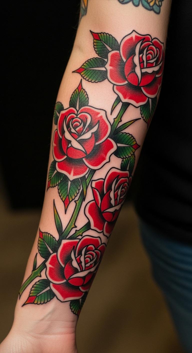 Roses bring a touch of beauty to your sleeve. They represent love or life, adding contrast to tougher symbols. Draw rough rose sketches at home using pencil and paper. Look for budget apps that let you color them digitally. Choose bright reds and greens for pop. Visit a nearby tattoo shop for quick consultations—they’re often free. Mix in thorns for an edge. This makes the design feel personal. Use everyday items like string to map out the layout on your arm. It saves money on custom drawings. Opt for larger petals to fight fading over time.