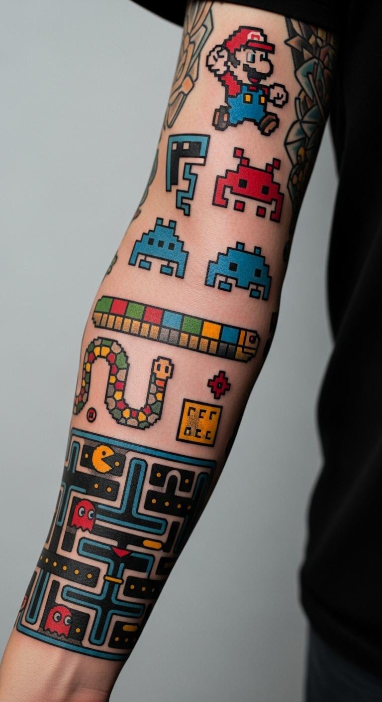 Retro gaming adds fun to your sleeve. Pixel art mixes with traditional for a modern twist. Create pixel designs on your computer for free. Combine with classic symbols. Use bright blocks for effect. Search online for artists with similar work. Place them strategically. Draw mock-ups at home. It helps visualize. Keep pixels large for durability.