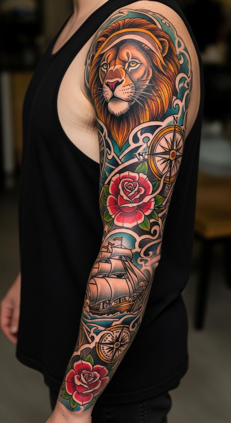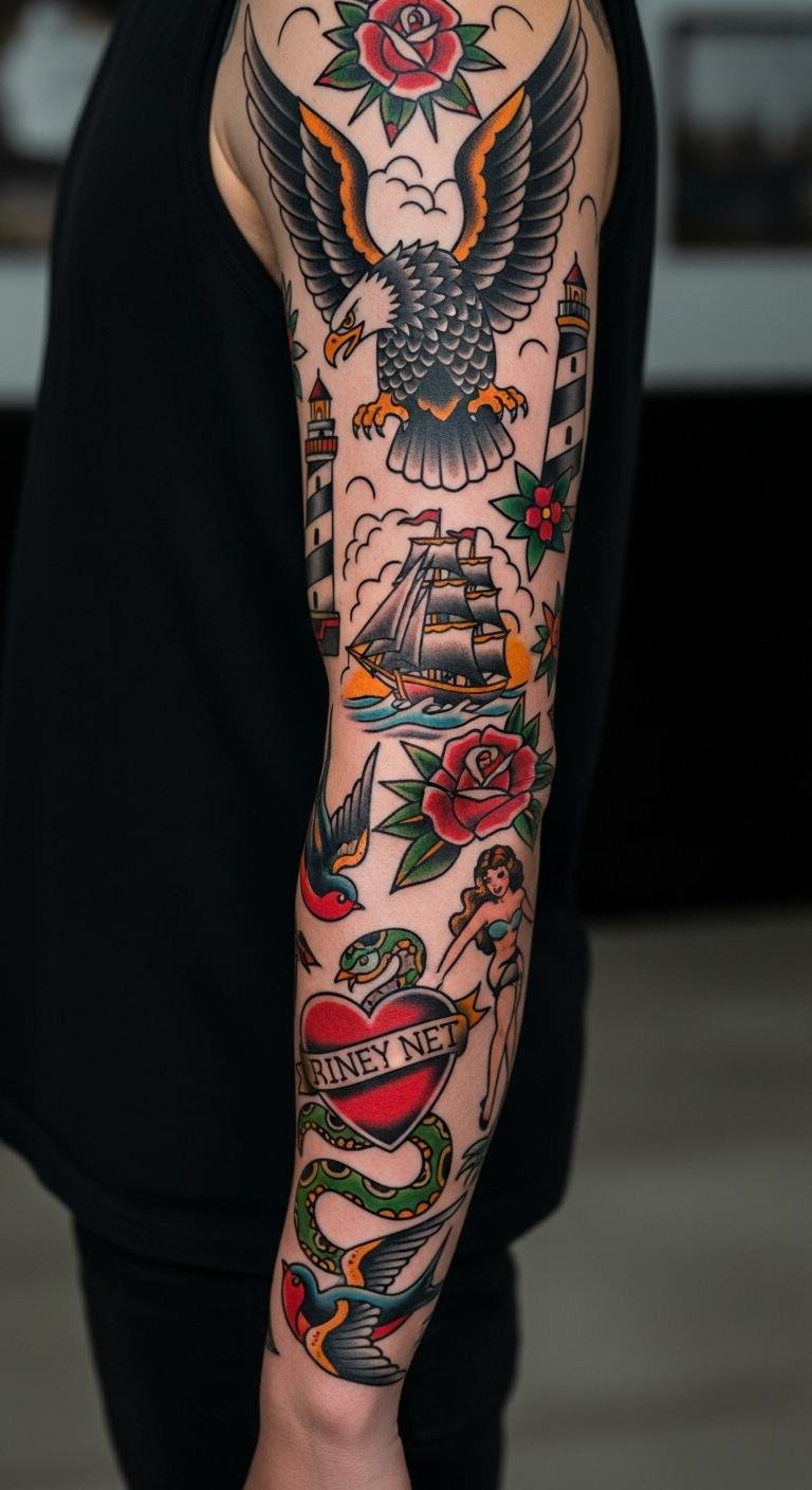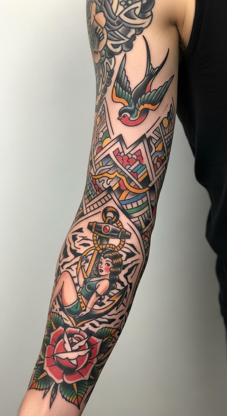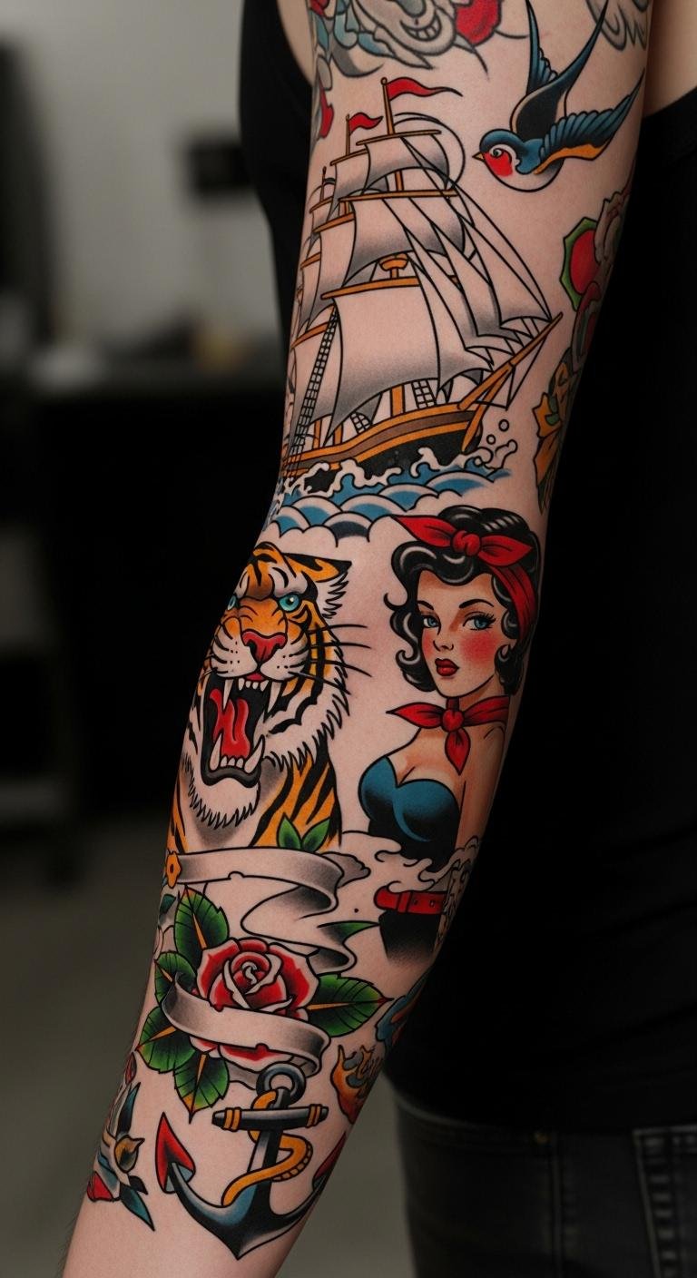 These 27 ideas show how American Traditional sleeves can reflect your story with bold style. Pick one that speaks to you, sketch it out, and connect with an artist to bring it to life—your next statement awaits.