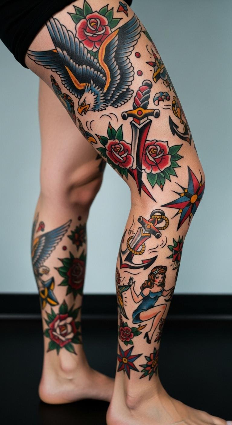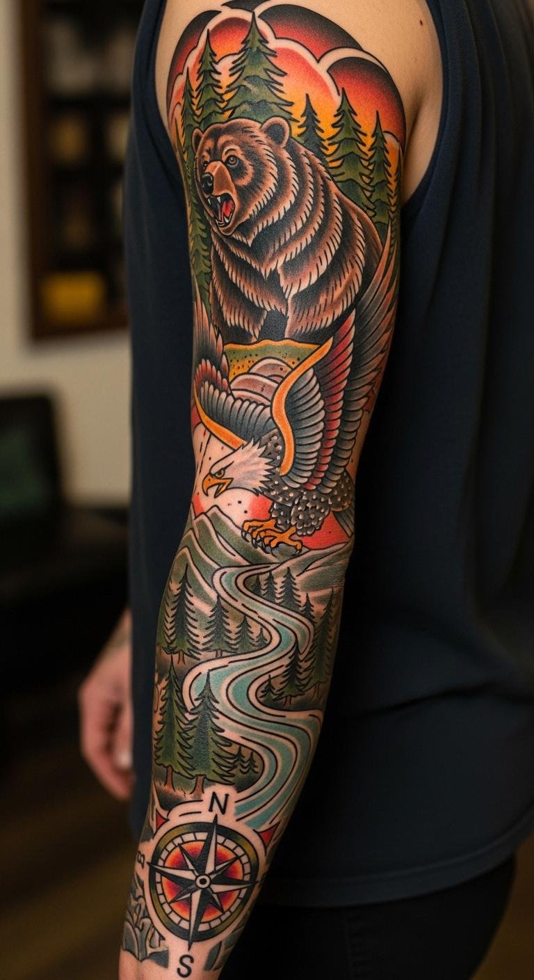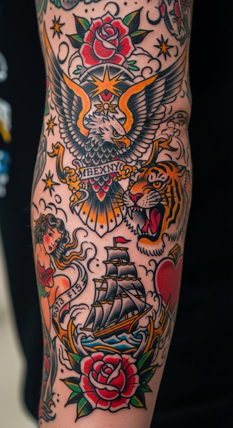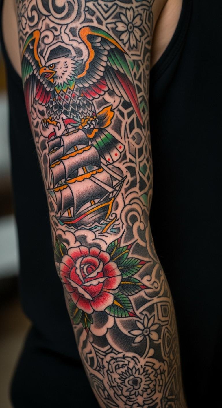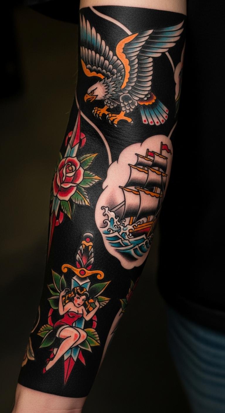 These 27 ideas show how American Traditional sleeves can reflect your story with bold style. Pick one that speaks to you, sketch it out, and connect with an artist to bring it to life—your next statement awaits.