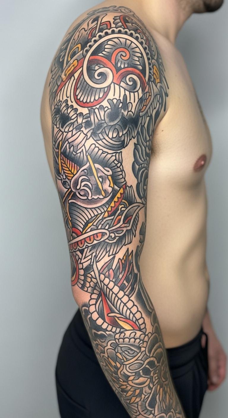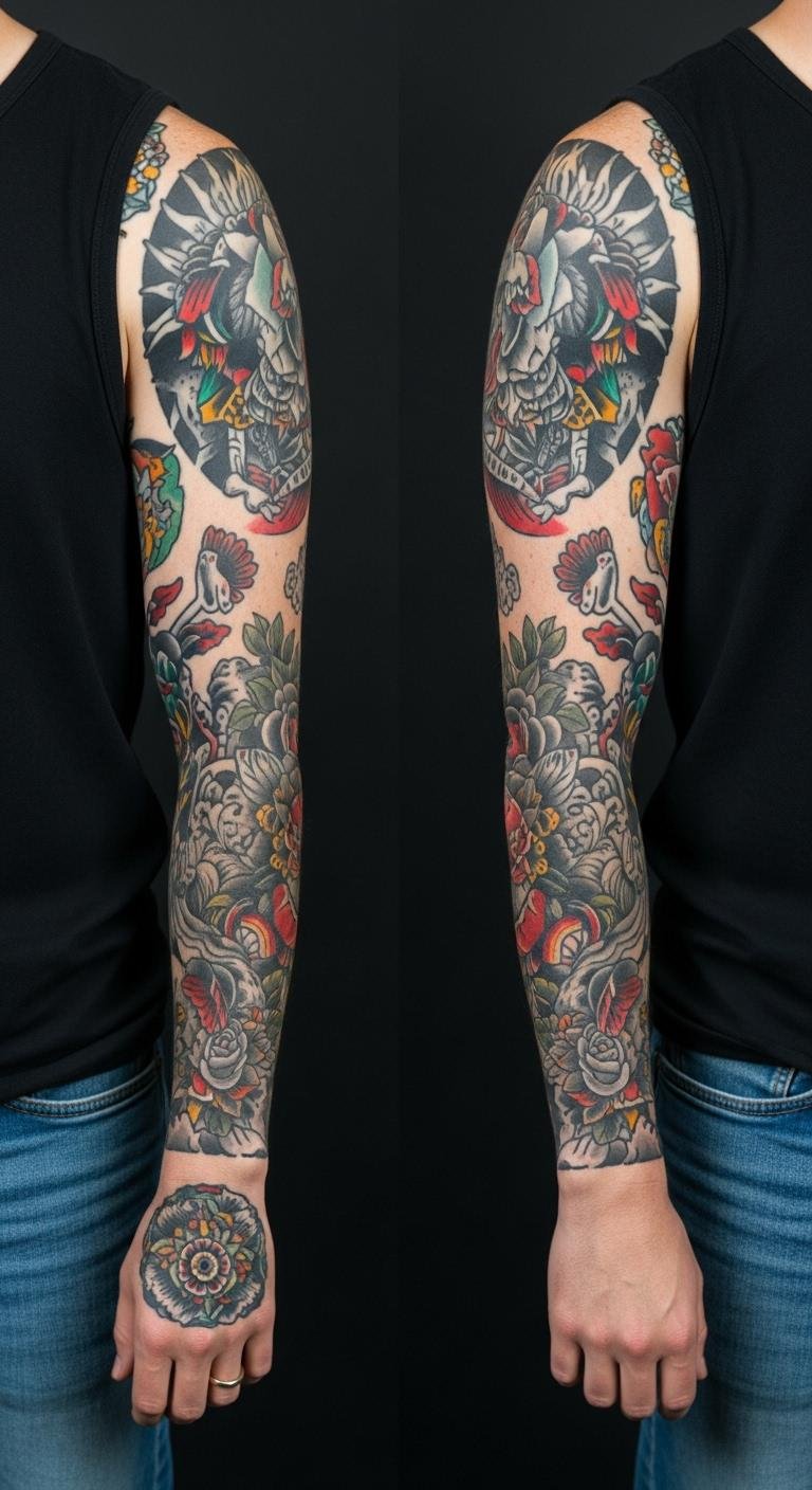 Neo-Traditional mixes old and new for a fresh sleeve. It keeps classic boldness but adds modern details. Start by modifying traditional designs with a free app on your phone. Add shading effects yourself. Choose colors that match your style. Look for artists offering package deals online. Combine motifs like eagles with abstract elements. This tells your story. Use photos of your arm to plan layouts at no cost. It makes the process fun. Focus on durable ink choices.