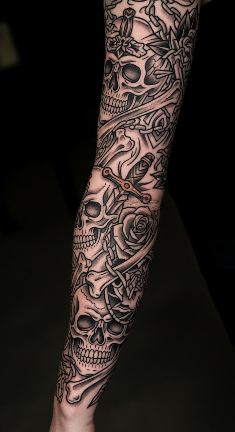 Skulls make your sleeve memorable. They symbolize mortality or resilience, blending well with other themes. Sketch basic skulls at your desk using free drawing tools. Experiment with bone arrangements on paper. Go for stark blacks to keep it striking. Reach out to community tattoo events for low-cost advice. Layer in roses or banners for depth. This adds meaning. Try positioning with mirrors at home. It avoids rushed choices. Emphasize clear outlines to maintain the look years later.