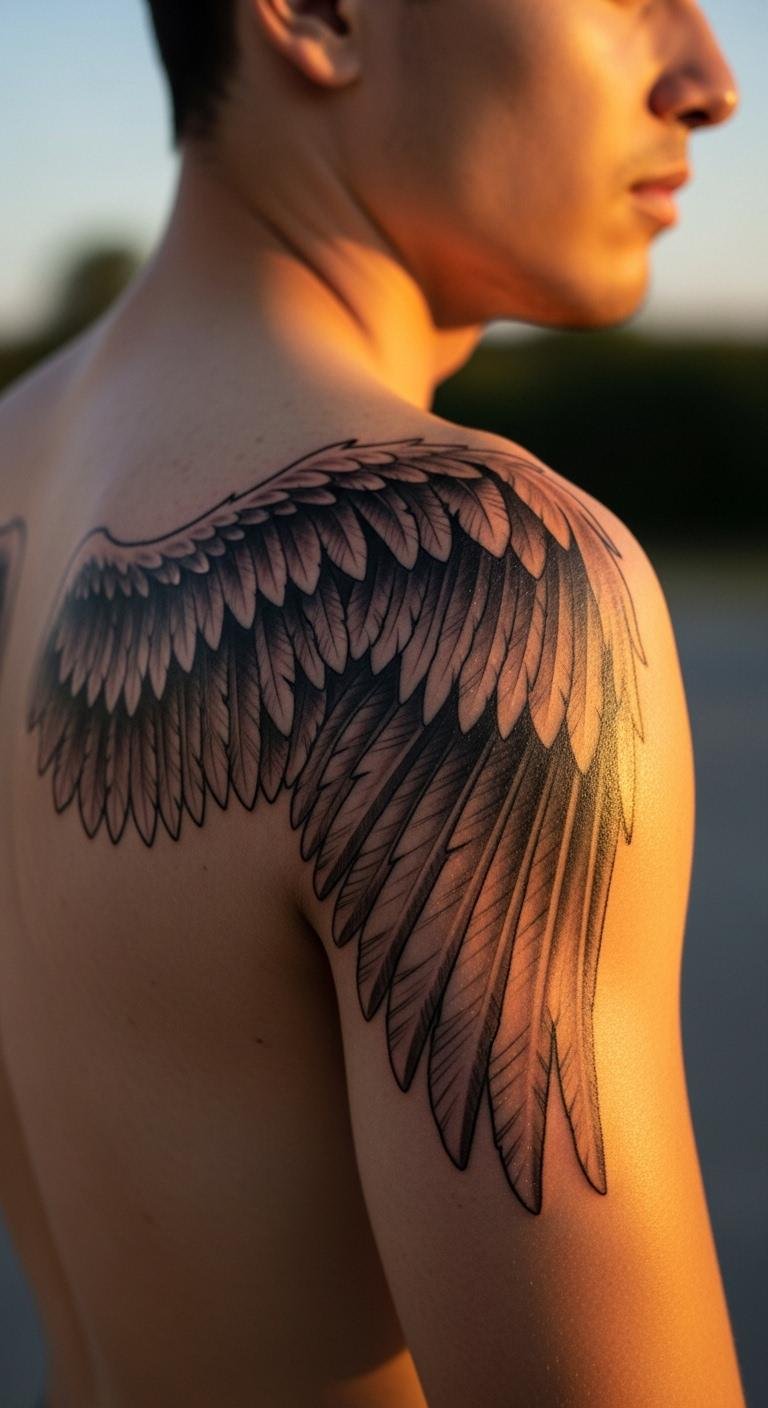Angel wings on the shoulder symbolize freedom and power, perfect for men wanting a subtle yet strong statement. Picture wings that spread across your deltoid for a dynamic look. Begin with affordable sketches using free tools like Canva. Save money by visiting community tattoo events where sessions cost less than $150. Simple actions: Draw rough wing outlines on your arm with a pen to visualize fit. Opt for smaller sizes if you’re testing the waters. Real DIY tip: Trace designs from printable templates found online and ink them temporarily with henna. This placement lets you show strength without overwhelming your body. Add elements like feathers for personal flair. The key is choosing designs that fit your lifestyle. Once done, it becomes a daily source of motivation.