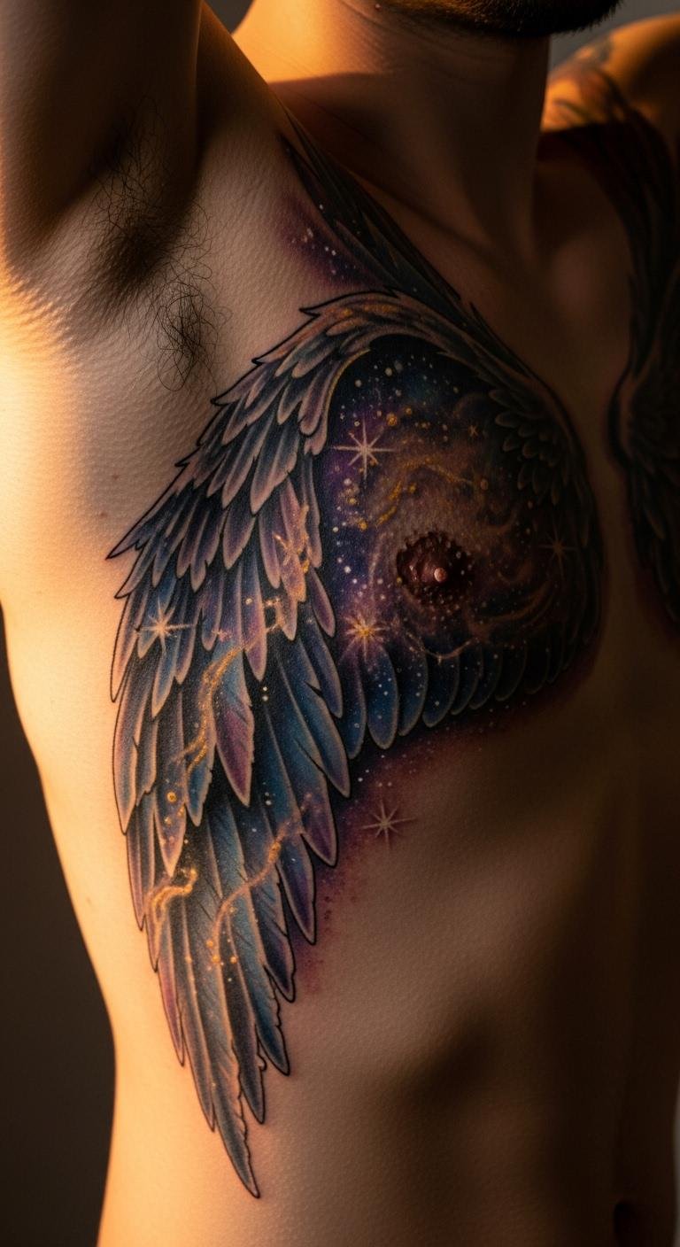 A warrior angel chest tattoo represents unyielding strength and defense, ideal for men embracing their battles. See it as armor for your soul. Start by noting ideas in a notebook—free and easy. Find budget artists at local shops for under $200. Break it down: Sketch the angel’s form on paper first. Choose compact designs to avoid high costs. Real DIY example: Use free software to edit stock images into your own version. This tattoo centers on the chest for a heart-close feel. Incorporate swords for added intensity. Keep lines clean for a striking effect. It’s about turning personal struggles into art. Simple planning makes the process smooth.