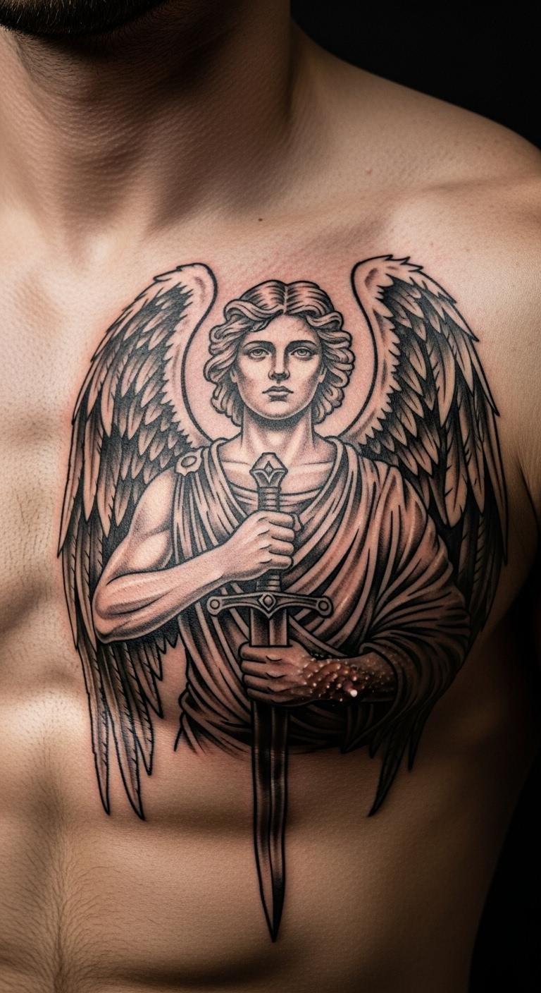 Angel on chest with sword tattoos show cutting-edge strength, front and center. See it as your core defense. Plan sword shapes. Look for chest deals. Sketch ahead. Build layer by layer. Real DIY tip: Edit free images. Chest spot amplifies impact. Add details for edge.