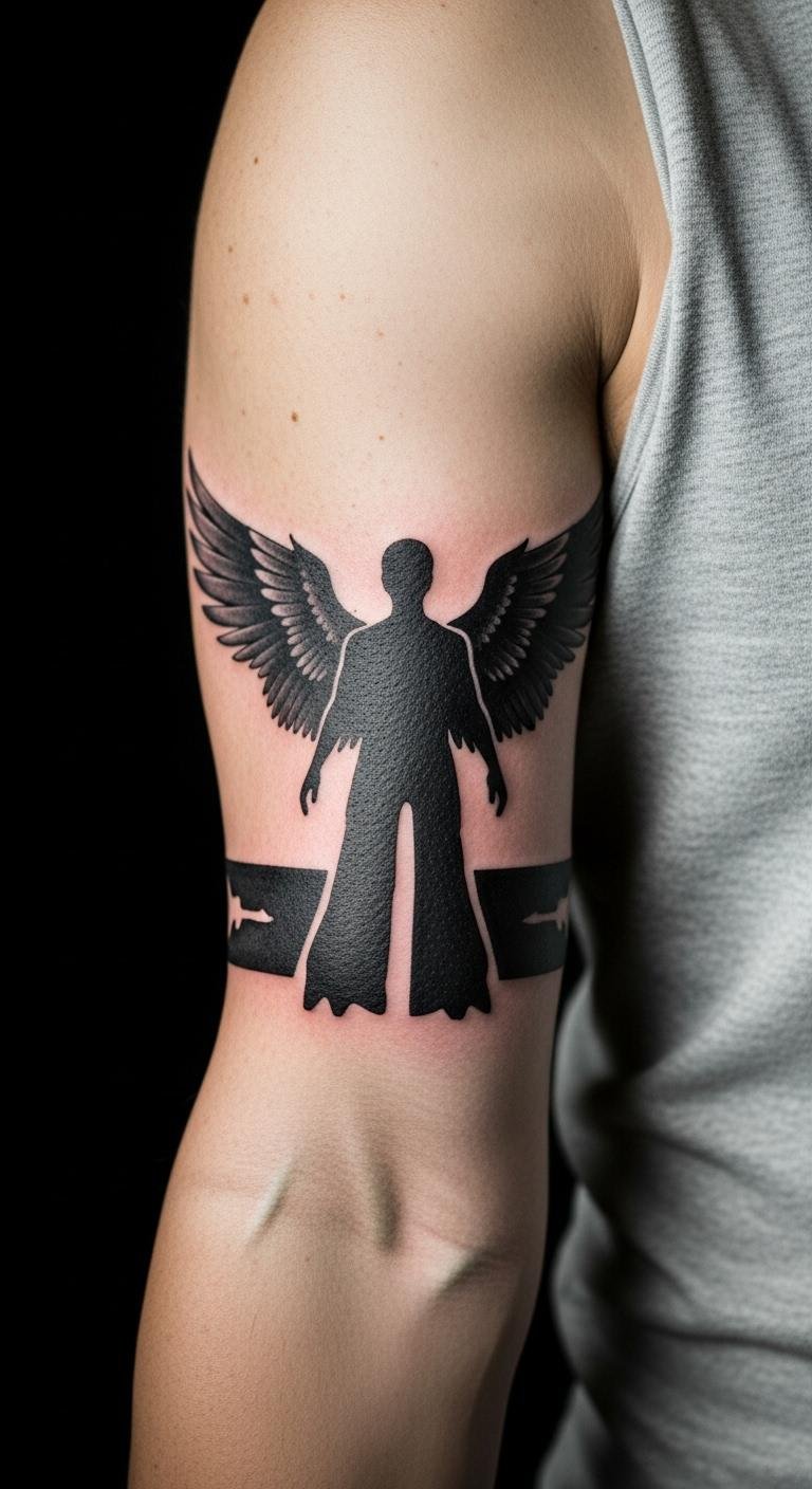 Bold angel silhouette armbands represent unbreakable strength, wrapping your arm in resolve. Think of it as a band of power. Draw silhouettes freehand. Find armband options for $100. Outline on arm. Keep it bold. Real DIY example: Cut from paper. Armband for constant wear. Simple yet strong.