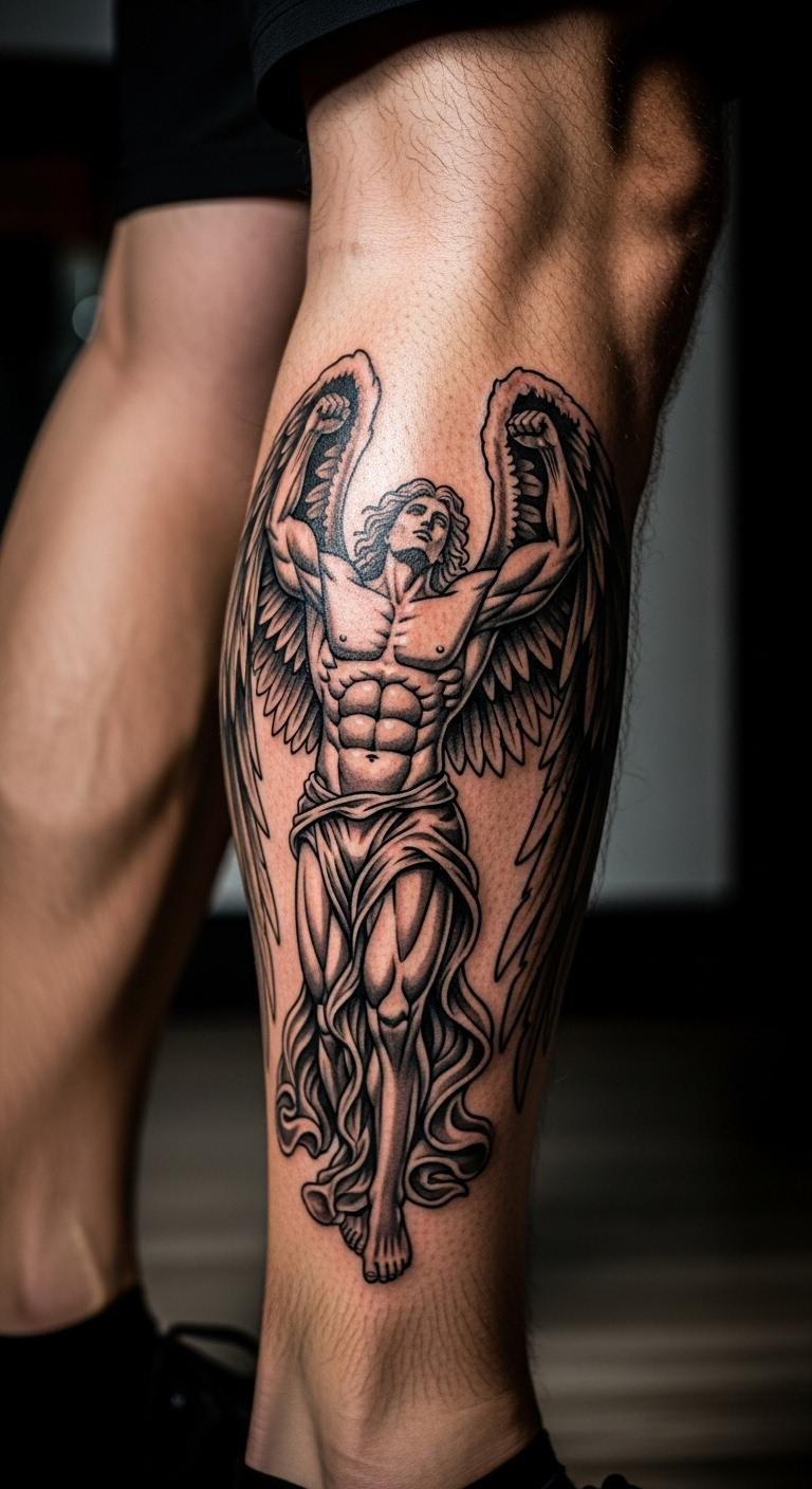 Strength-inspiring angel calf tattoos fuel your steps with power, perfect for leg-focused ink. Picture an angel propelling you. Note calf ideas. Get it for $120. Practice drawing. Choose calf for visibility. Real DIY tip: Use leg stencils. Add power symbols. Walk with confidence.