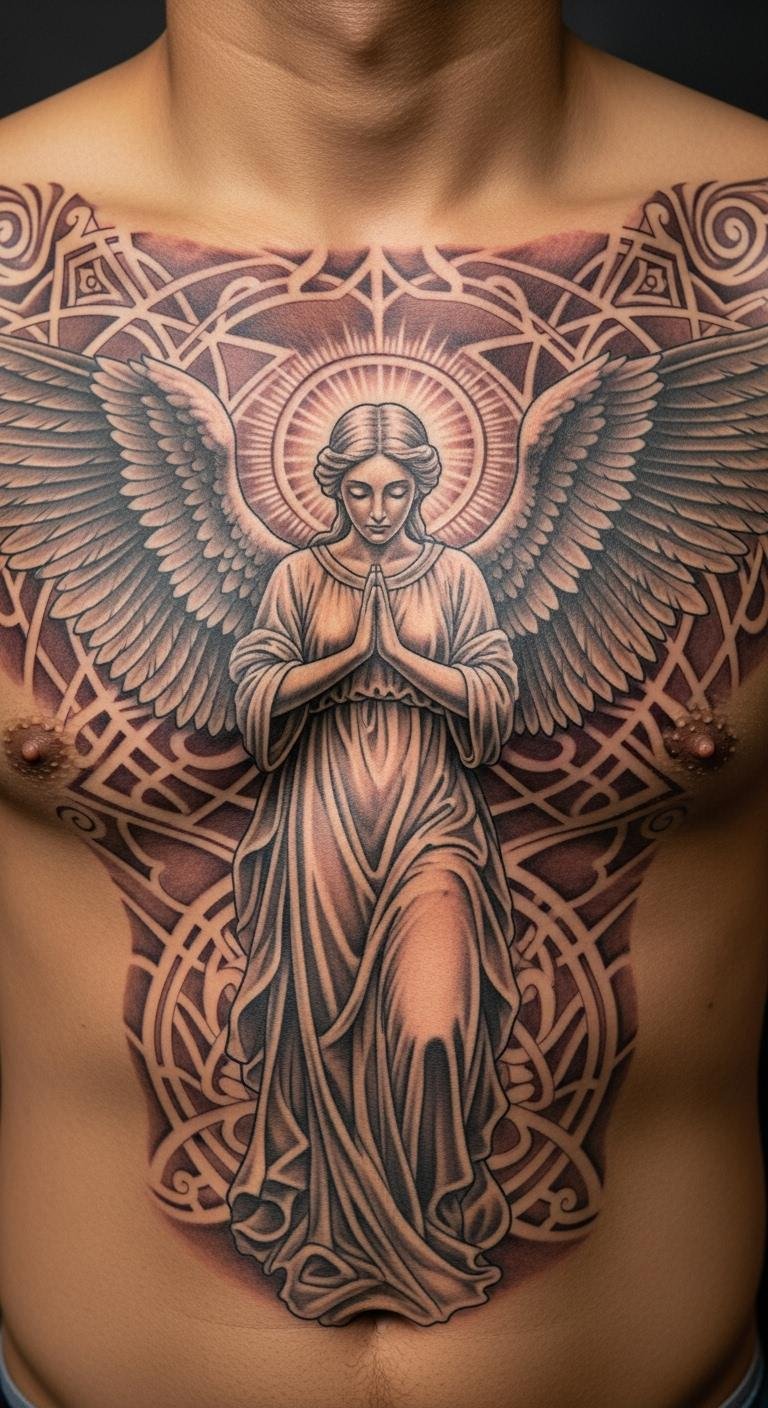 Angel with halos chest designs radiate inner strength, lighting up your torso. See it as a glow of power. Draw halos free. Get chest ink for $180. Sketch designs. Layer halos. Real DIY example: Use circular tools. Chest for heart strength. Shine on.