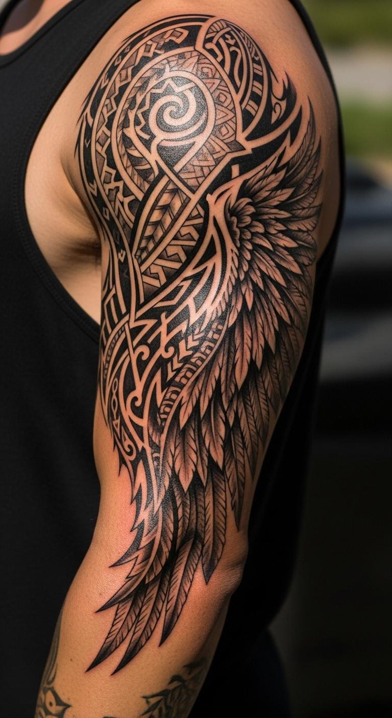 Tribal fusion angel arm tattoos merge cultures for robust strength, blending styles on your arm. Picture fused patterns. Combine ideas at home. Find fusion for $130. Draw tribal lines. Opt for arm flow. Real DIY tip: Mix tribal stencils. Arm for cultural power.