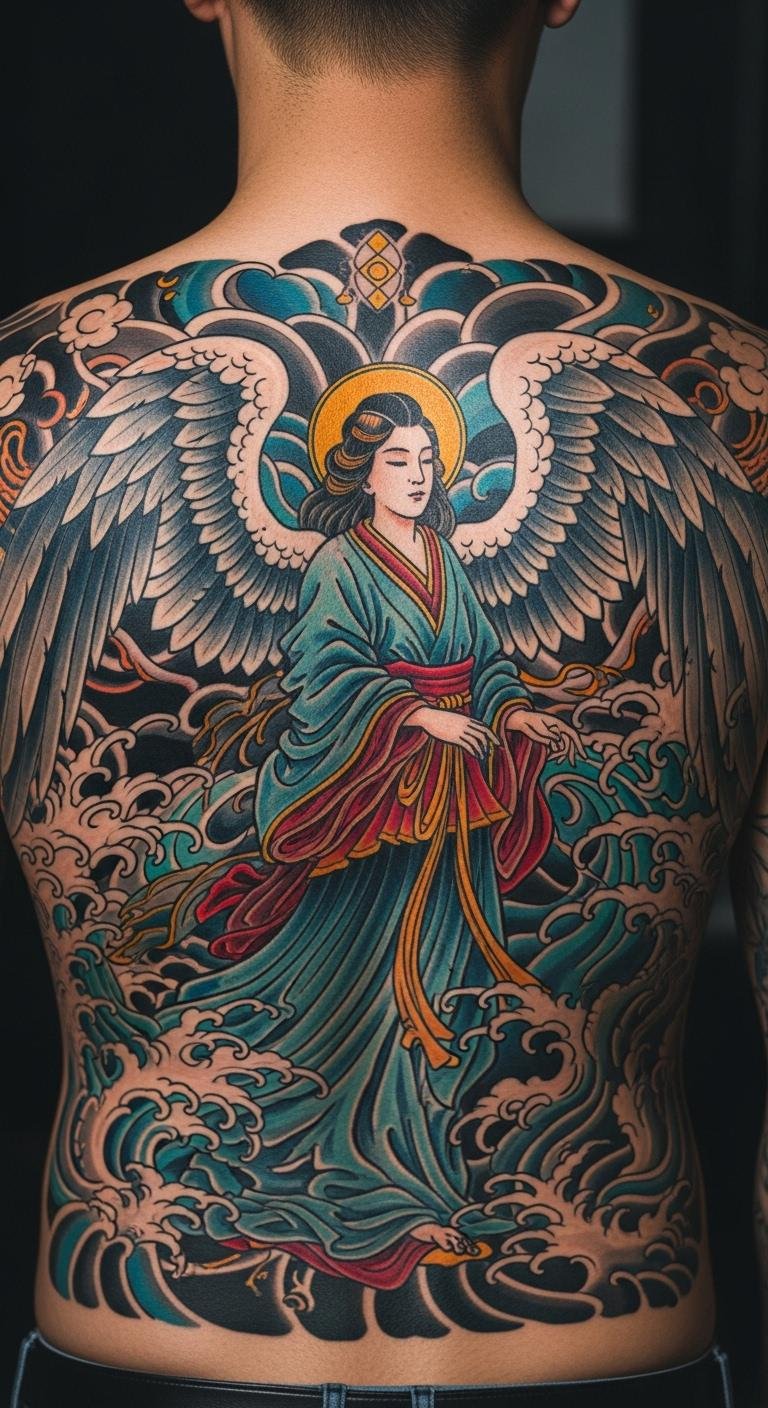 Japanese-inspired angel back tattoos infuse Eastern strength into your ink, covering your back with flair. Think waves and angels. Sketch Japanese motifs. Get back designs for $250. Plan carefully. Choose back space. Real DIY idea: Study Japanese art. Back for full impact.