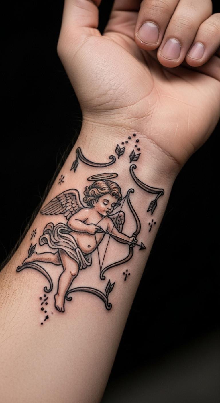 Cupid angel wrist tattoos blend love and strength, providing a discreet way to show your might. Think of it as a personal charm. Use your phone’s drawing app for initial ideas—no cost involved. Seek out flash sales online for prices under $80. Start simple: Outline arrow shapes on your skin with a washable pen. Opt for small sizes for affordability. Real DIY tip: Make stencils from cardboard and print free designs. Wrist placement keeps it hidden or shown as needed. Layer in hearts for emotional depth. It’s an easy way to carry strength daily.