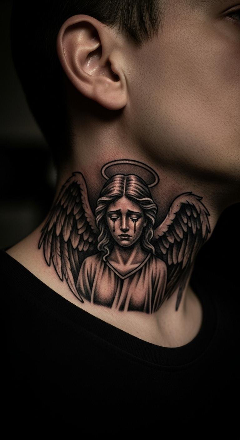 Memorial angel neck designs honor lost ones while inspiring personal fortitude, turning grief into power. View it as a tribute that empowers. Scribble memories on paper to begin. Find affordable artists through social media for about $100. Break it into parts: Draw angel forms at home. Choose narrow designs for the neck area. Real DIY example: Use free apps to combine photos into tattoo concepts. This spot adds a layer of strength near your head. Include dates for personalization. It helps process emotions through art.