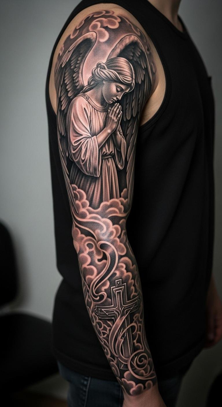 Black and gray shaded angel sleeves deliver enduring strength through classic style, covering your arm in resilience. See it as a canvas of courage. Start with free online shading tutorials. Look for package deals at shops for under $300. Simple plan: Sketch arm layouts on paper. Build up from small sections. Real DIY idea: Experiment with gray markers on your skin. This design flows from shoulder to wrist for total impact. Add clouds for heavenly vibes. It’s a practical way to display power.