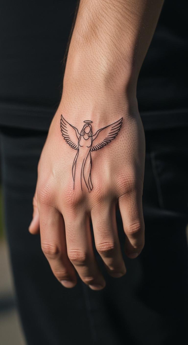 Minimalist line art angel hand tattoos offer clean strength, perfect for men who prefer less but mean more. Imagine precise lines that say it all. Draw basics on paper with a pen. Grab budget sessions for around $60. Take it slow: Trace lines on your hand first. Keep it tiny for quick work. Real DIY tip: Use string art kits to practice at home. Hand placement makes it a constant reminder. Focus on core shapes for power. Easy and effective.