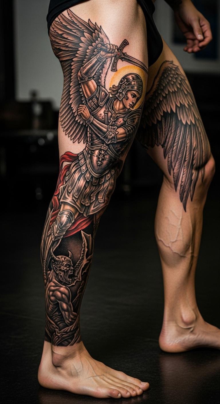 Archangel Michael full leg tattoos depict heroic strength, turning your leg into a pillar of power. See it as your battle story. Plan with free drawing tools. Look for leg specials under $400. Break down the figure step by step. Start small with partial designs. Real DIY idea: Assemble from online references. Leg placement shows off your stride. Add weapons for intensity. Pure motivation in ink.
