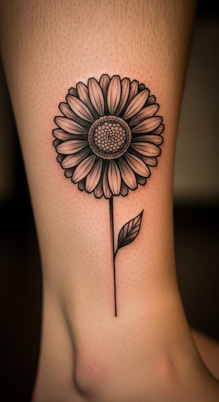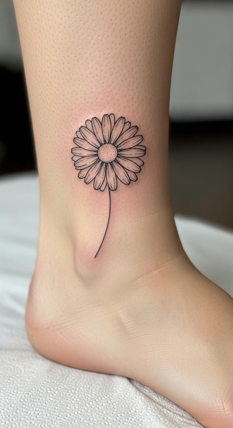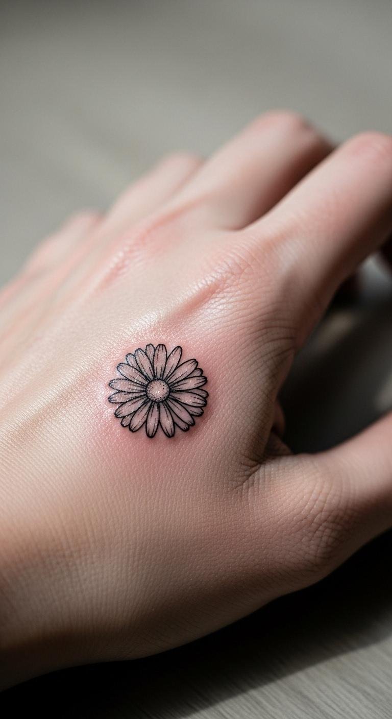 Think simple lines and clean shapes for a minimalist daisy tattoo. This style keeps things understated and elegant, perfect if you want something that won’t overwhelm your look. Start with a small daisy outline on your wrist or finger – it’s quick and affordable at most studios. Break it down: sketch a basic daisy at home using a pen and paper, then snap a photo to show your artist. Budget-friendly tip: Local shops often charge under $50 for tiny designs, so check for walk-in deals. Add a personal twist, like a tiny stem, to make it your own without extra cost. You’ll appreciate how it fades into daily life. For DIY practice, trace daisy shapes from free online templates and try drawing on paper first. Keep it light and meaningful – this tattoo speaks of fresh starts without the fuss.
