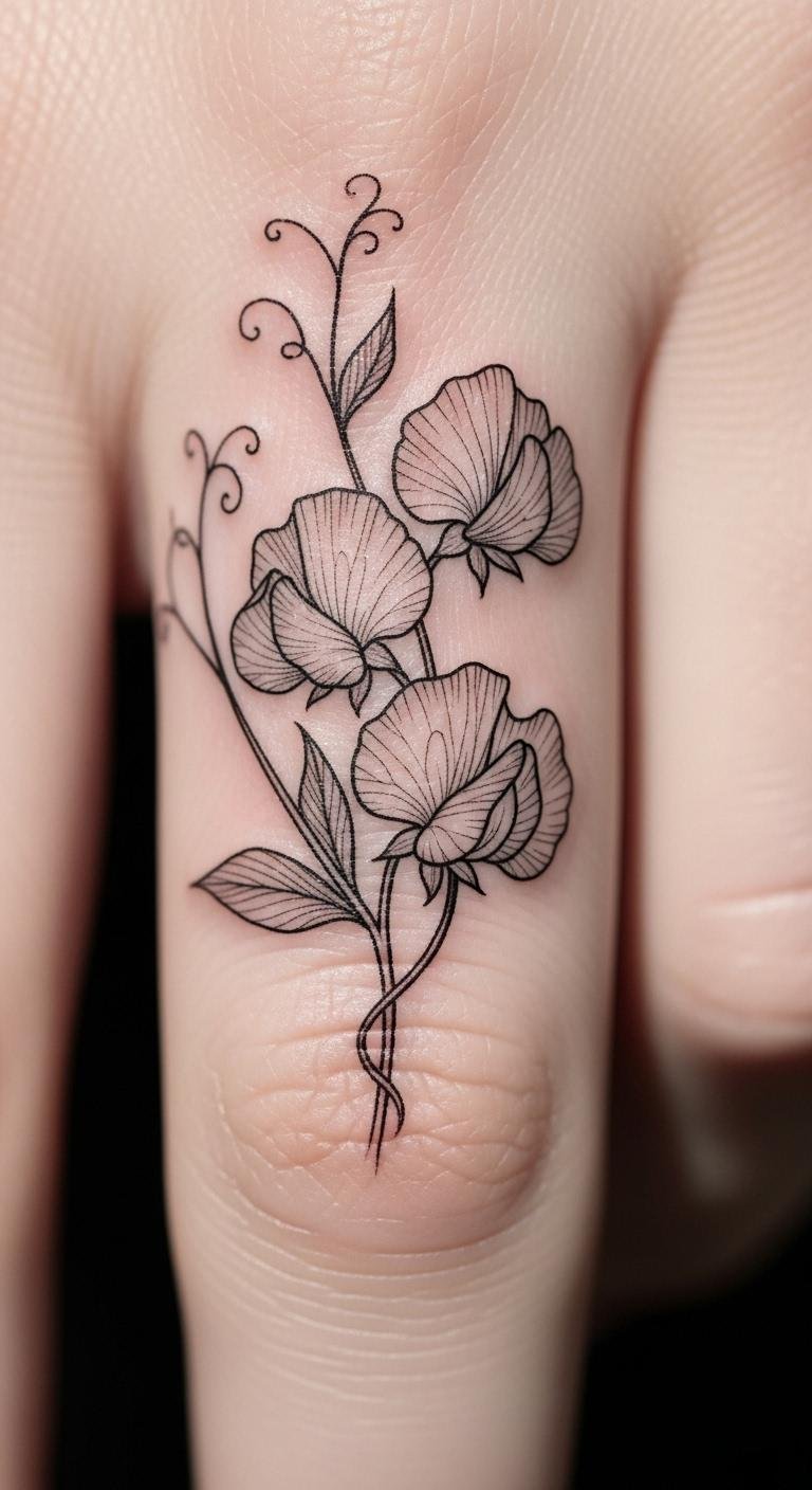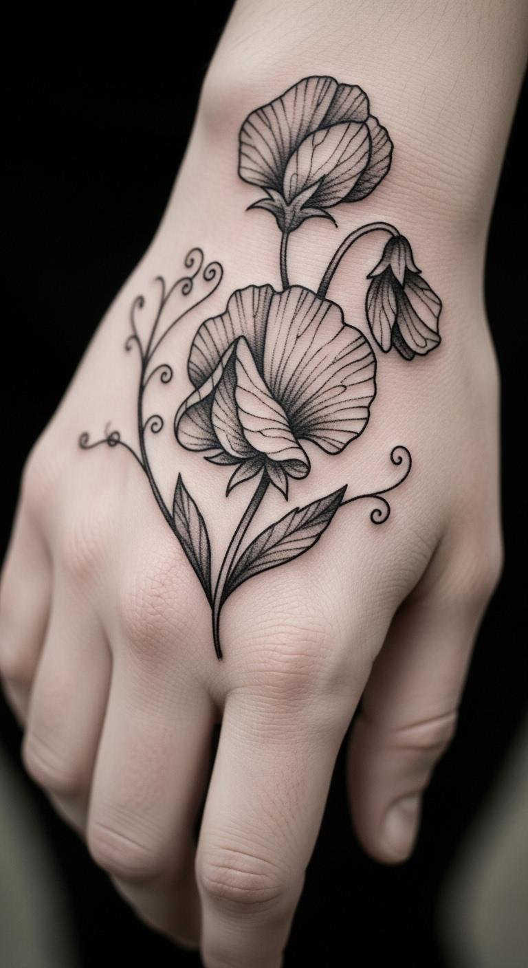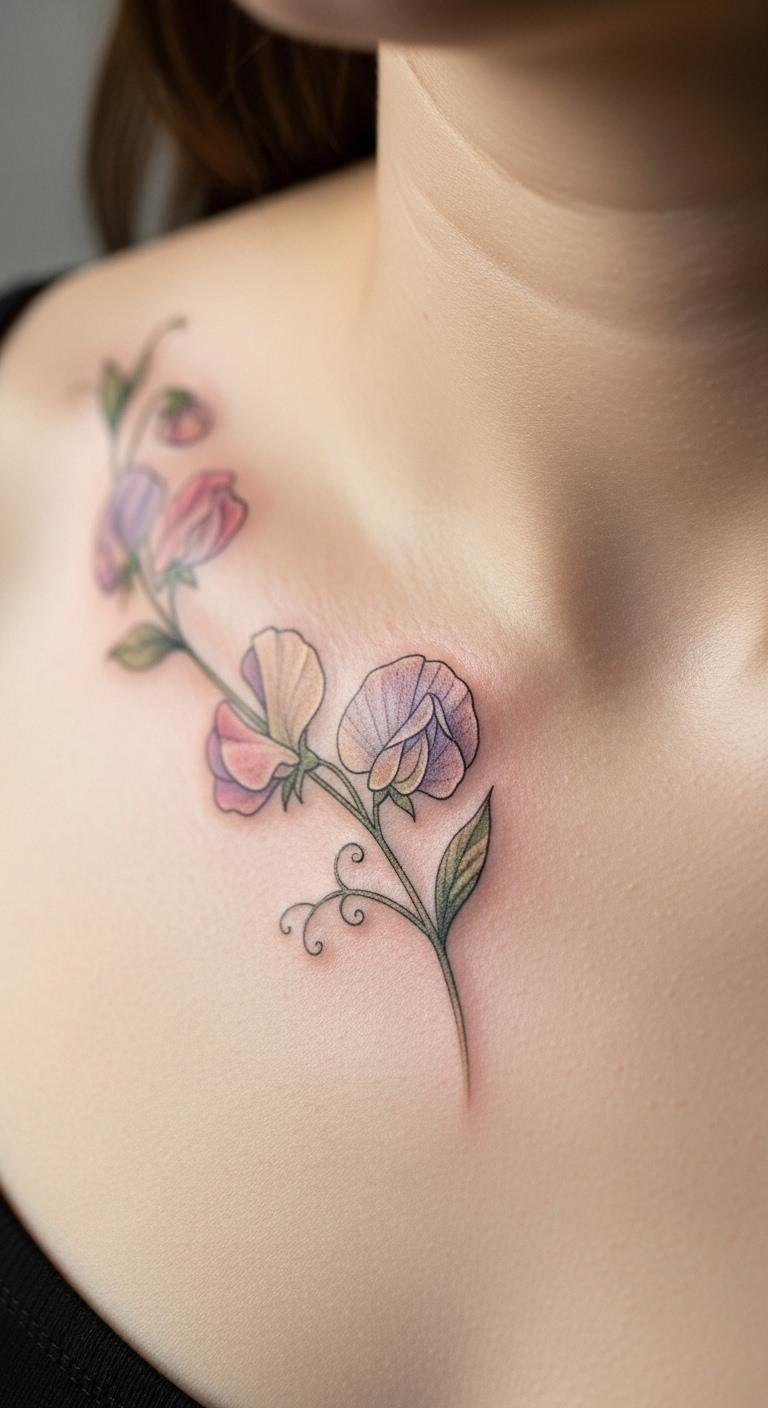 Go for a watercolor sweet pea tattoo if you love soft, blended colors that mimic paint on skin. This design brings a playful, artistic feel, ideal for symbolizing friendship or renewal. Choose a spot like your shoulder for easy hiding or showing off. Practical advice: Use phone apps to overlay sweet pea images on your body photo before committing – it’s free and helps visualize. Budget tip: Opt for smaller sizes to keep costs around $100; many artists offer deals for first-timers. Add elements like leaves for a custom touch at no extra charge. Practice by watercolor painting a sweet pea on paper using cheap supplies from a dollar store. It’s an easy way to test ideas and ensure the final tattoo matches your story.