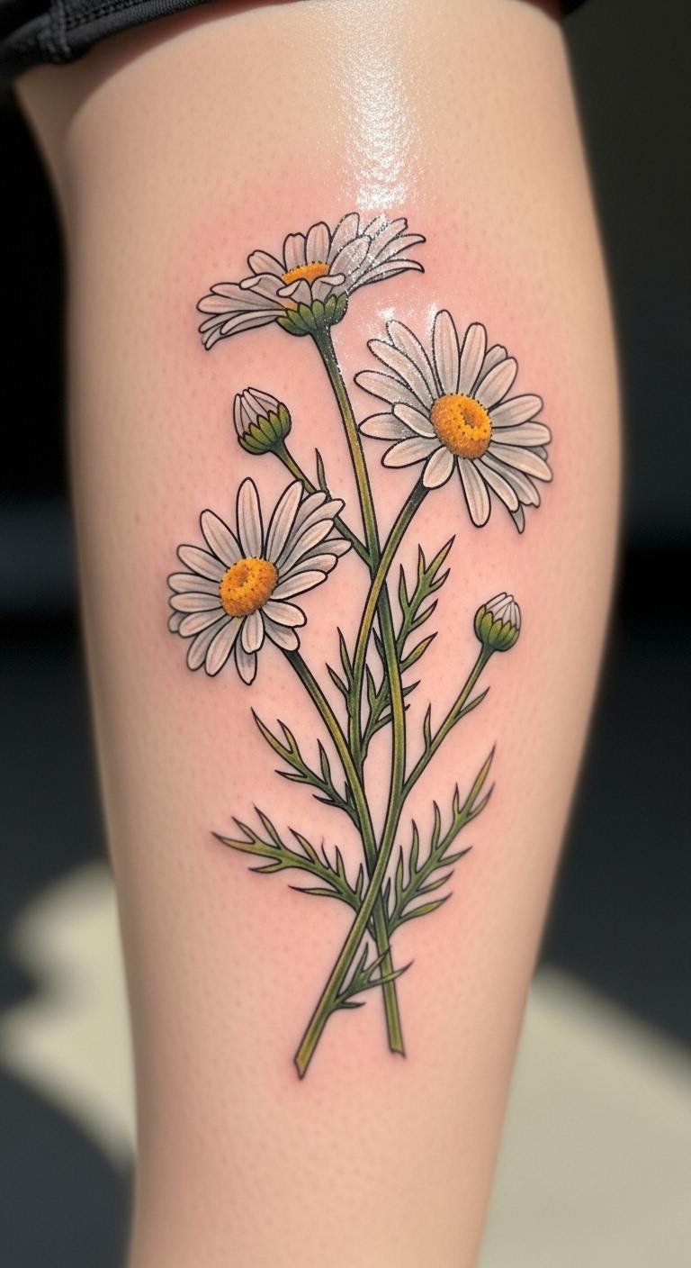 Capture spring’s energy with a daisy tattoo featuring new buds, perfect for personal growth themes. Opt for your leg to show it off seasonally. Actionable idea: Draw seasonal elements from nature walks. Affordable option: Seasonal promotions can drop prices to $130. Add growth symbols. Collect leaves for home inspiration. It’s a fresh, budget way to renew.