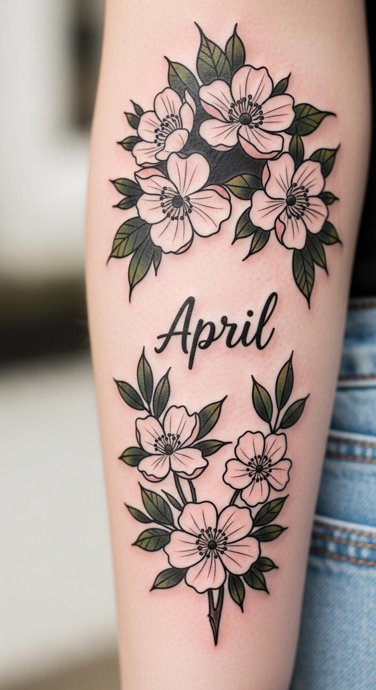 Incorporate butterflies or birds into your April flower tattoo for a fun, whimsical vibe that highlights joy and innocence. Put it on your thigh for a larger canvas. Easy idea: Mix in doodles from kids’ books for inspiration. Budget tip: Smaller whimsical adds keep prices at $110. Personalize with your favorite creature. Use colored pencils for home trials. This makes tattooing enjoyable and accessible.