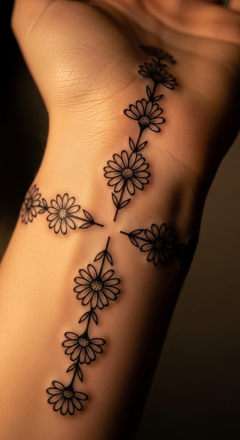 A daisy chain tattoo represents unbreakable bonds, making it great for friends or April birthdays. Link a few daisies in a row for a flowing design that wraps around your arm or ankle. Keep it straightforward to save on time and money. Easy action: Draw a chain of daisies on paper with a marker, then share it with your tattoo artist for tweaks. Affordable idea: Look for group sessions at studios where pals get matching ink for less – sometimes 20% off. Personalize by adding a friend’s initial subtly. For DIY fun, string real daisies into a necklace as a low-cost mock-up. This tattoo adds a touch of continuity to your life without much hassle.