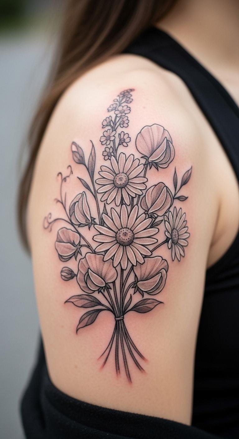 Mix daisies and sweet peas into a bouquet tattoo for a fuller, garden-like effect that screams spring renewal. Place it on your back or thigh for a versatile option. This design packs more symbolism, like love and innocence, into one spot. Simple tip: Use free design apps to combine flower images and preview on your skin. Save money: Ask for a smaller bouquet to cut costs to about $150; some places offer payment plans. Make it yours by including a favorite color or element. Try arranging fake flowers at home as a DIY test run. It’s a straightforward way to celebrate new chapters affordably.