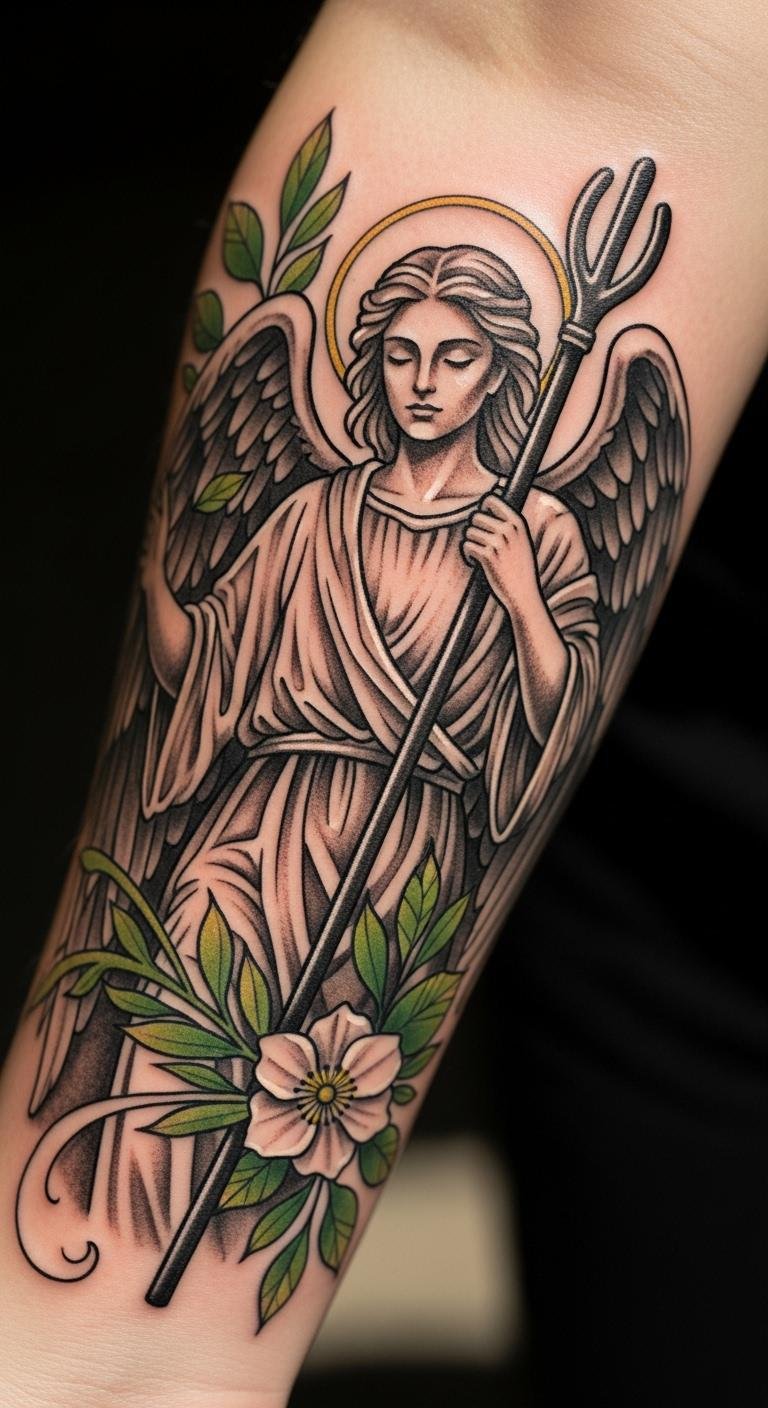 Raphael symbolizes healing and renewal. Add florals for a personal health story. Sketch basic ideas on plain paper first. Look for artists with portfolio discounts. Place it on your ankle for a discreet option. Include initials with simple stamps. Break the tattoo into phases for budget control. Focus on key symbols like the staff for meaning. Practice drawing leaves at home with pencils. This setup keeps things affordable and quick. Feel the comfort of protection in your routine.