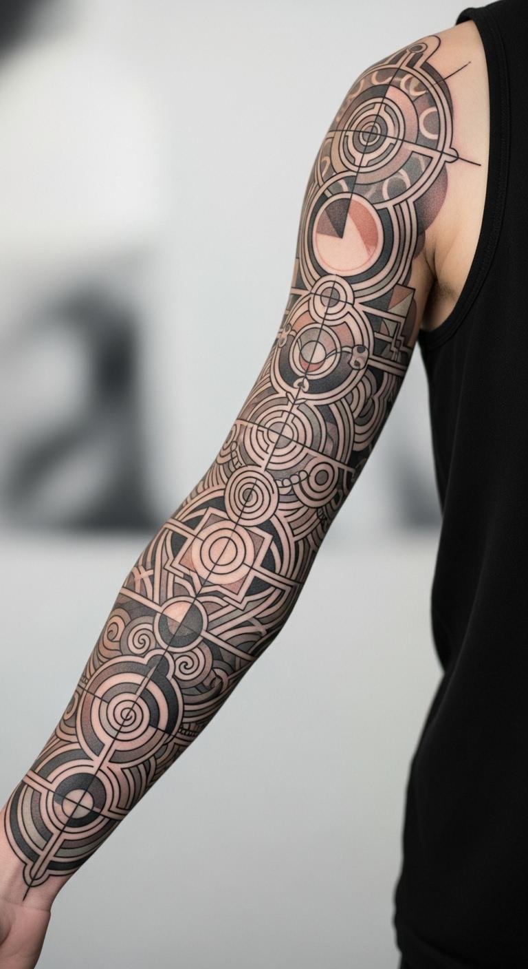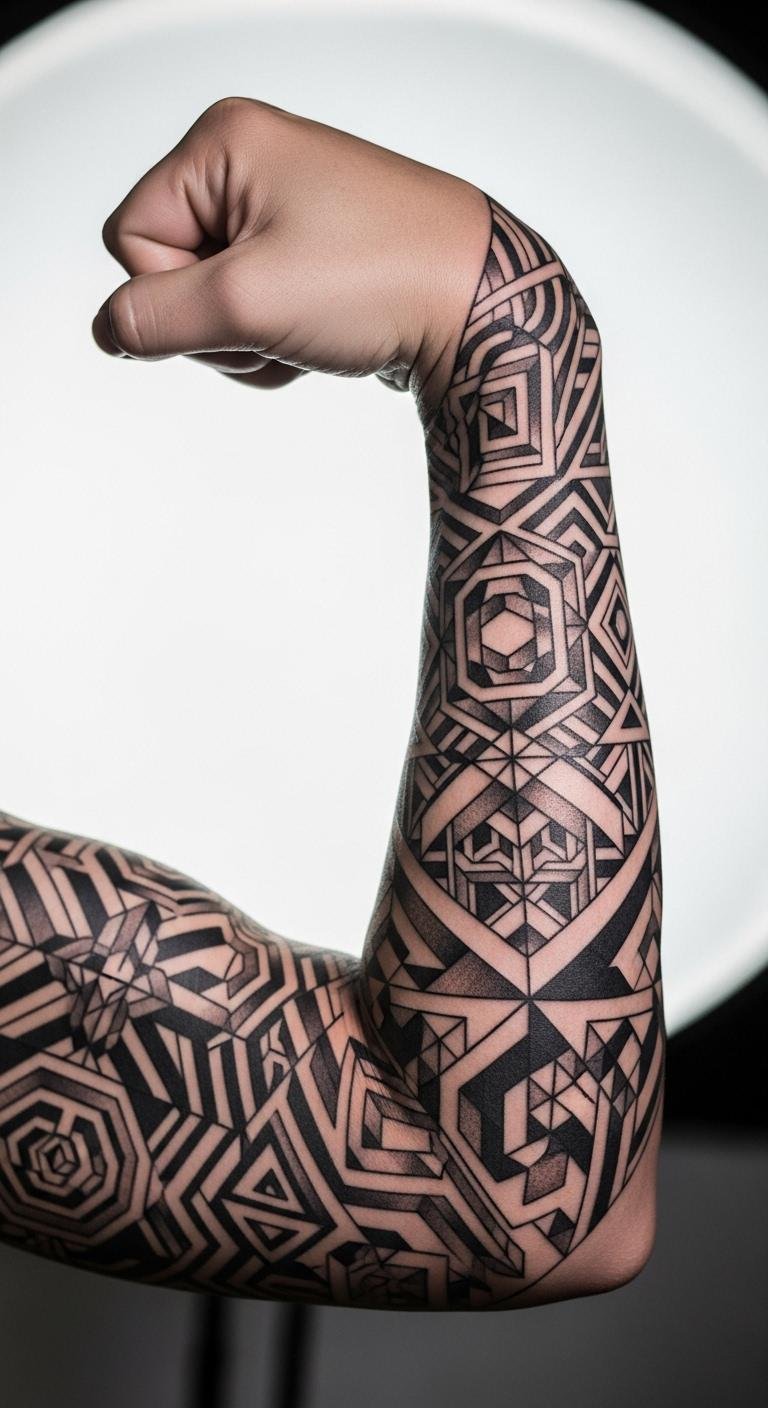 A geometric sleeve tattoo uses shapes like triangles and circles for a clean look. Picture sharp angles wrapping your arm for a modern vibe. This design stands out but stays simple. Start with a small sketch on paper to plan it. Many artists offer budget options under $200 for basic versions. Try a DIY template online using free drawing apps. Keep sessions short to manage costs—aim for one hour at a time. Bold elements like geometric patterns add flair without overwhelming your skin. If you’re new, choose an artist who specializes in this style; they often have affordable packages. Mix in personal touches, like a favorite symbol, to make it yours. Healing is straightforward with basic lotion from your home. Think about adding waterproof ink for daily wear. This tattoo works well for everyday outfits, giving you that extra edge.
